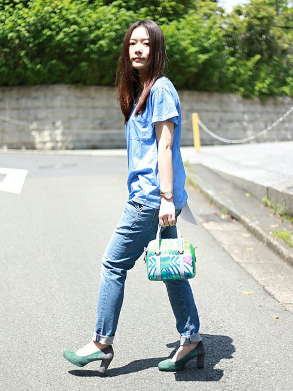 シンプルに同系色でまとめた初夏のスタイリング。 Hashibamiのカラフルなハンドバッグはアクセントにぴったり。小ぶりながら存在感のあるデザインがポイントです。 ラフな半袖Tシャツはどんなアイテムにも合わせやすい万能アイテムです!