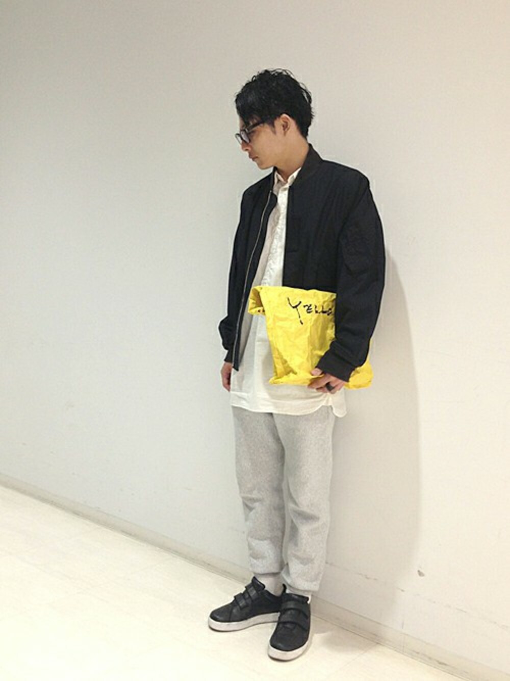 高密度コットンナイロンタイプライター素材のMA-1ブルゾンに、チャンピオン別注スウェットパンツを合わせたカジュアルなスタイリング。 全体のカラーをモノトーンでまとめつつ、アルミ素材のレコードバッグをアクセントに。