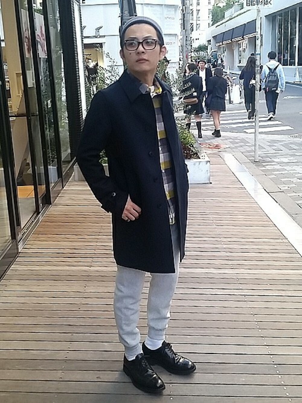 メルトンコートとスウェットパンツを組み合わせた今期イチオシのスタイリング。
