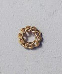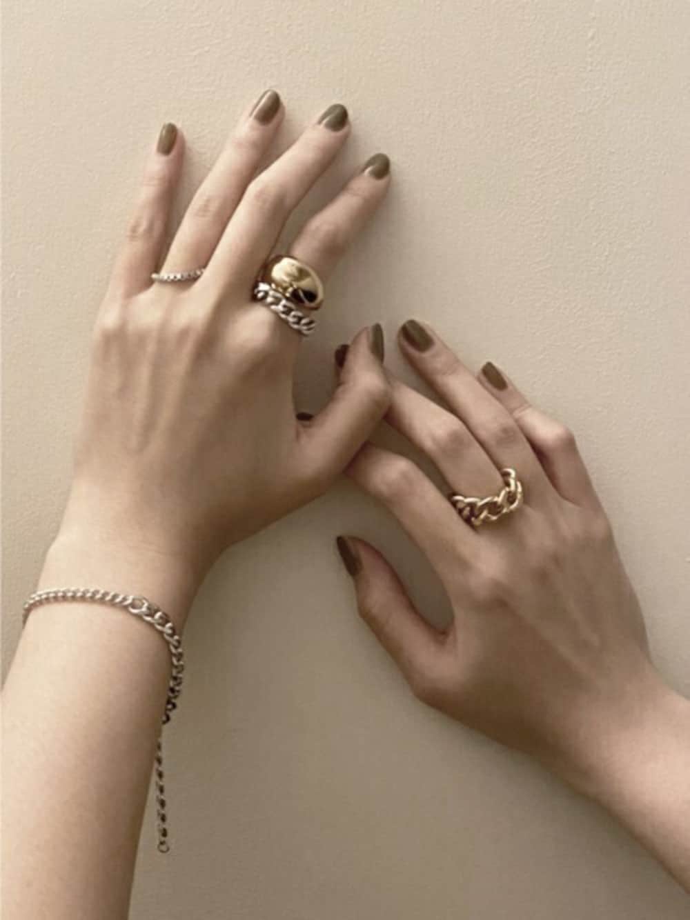 【 Gold×Silver 】 たっぷりとしたサイズ感のリングと、チェーンリングの重ね着けがポイント。 ゴールド×シルバーのコンビカラーでまとめて、クールになりすぎず柔らかい印象に。
