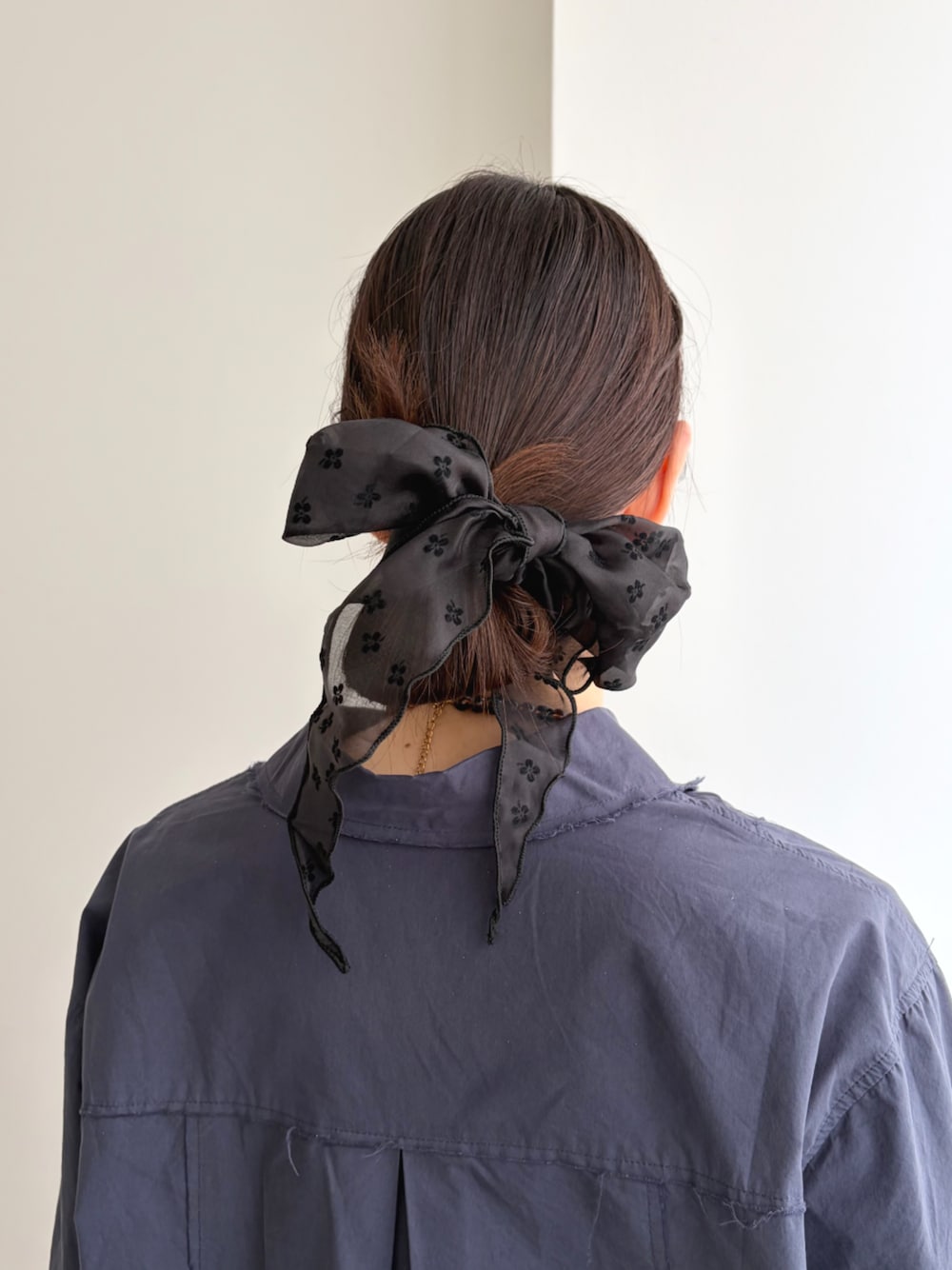 サンカクのスカーフなので髪にも付けやすいです! シアー感もあってこれからの季節にぴったりです◎