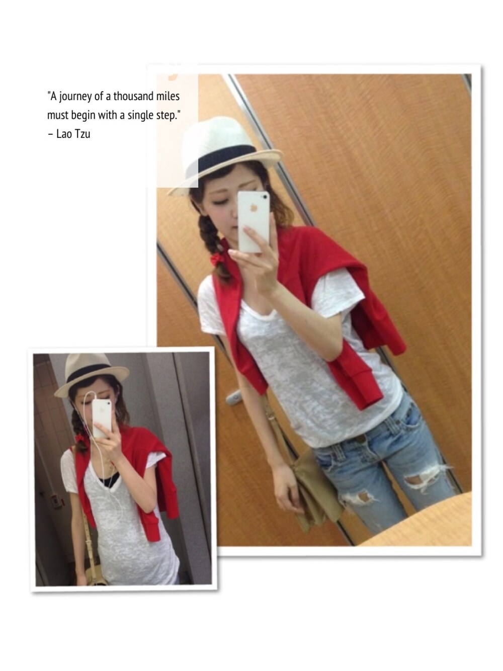 ブルー系のデニムパンツを着用したレディースの春コーディネートの1枚目の写真