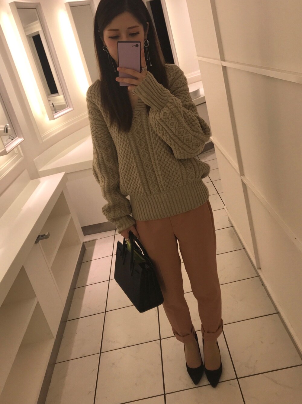ブラック系のパンプスを着用したレディースの冬コーディネートの1枚目の写真