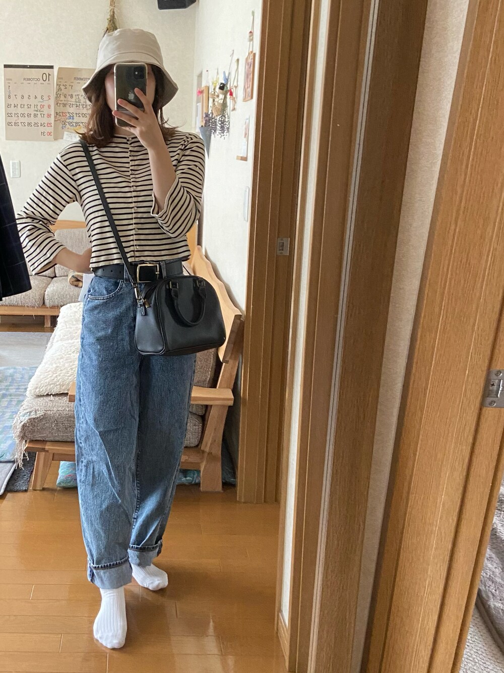 着用コーデ:410件soiのカーディガン/ボレロ「7分袖テレコボーダーリブチビカーディガン」を使ったコーディネート