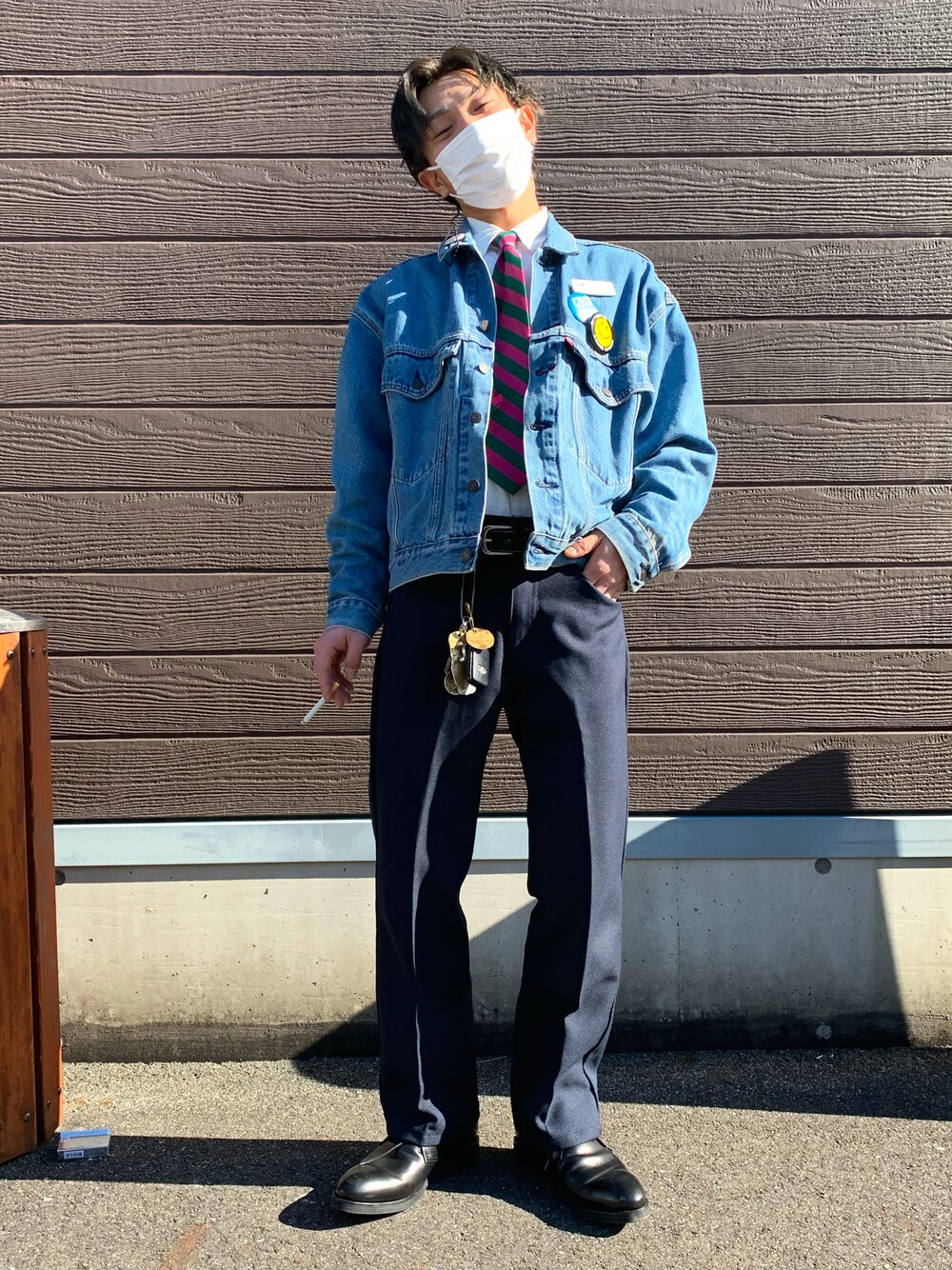 ビジネス感もなくデニムジャケットがいい感じにマッチした レジメンのネクタイも可愛い