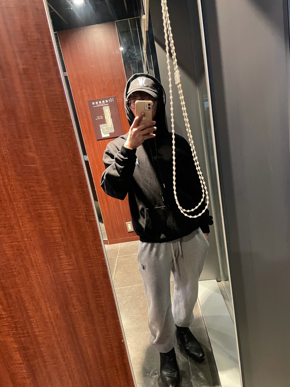 ちゃたろうのスウェットパンツ「『WOOALONG/ウアロン』Signature jogger pants/ブランドロゴ ジョガースウェットパンツ」を使ったコーディネート