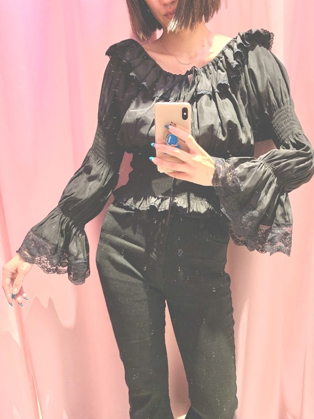 可愛いフリルブラウスもオールブラックで大人っぽくコーディネート🏌️♂️ トップスは肩落としてオフショルとしても着れちゃいます🏋🏽