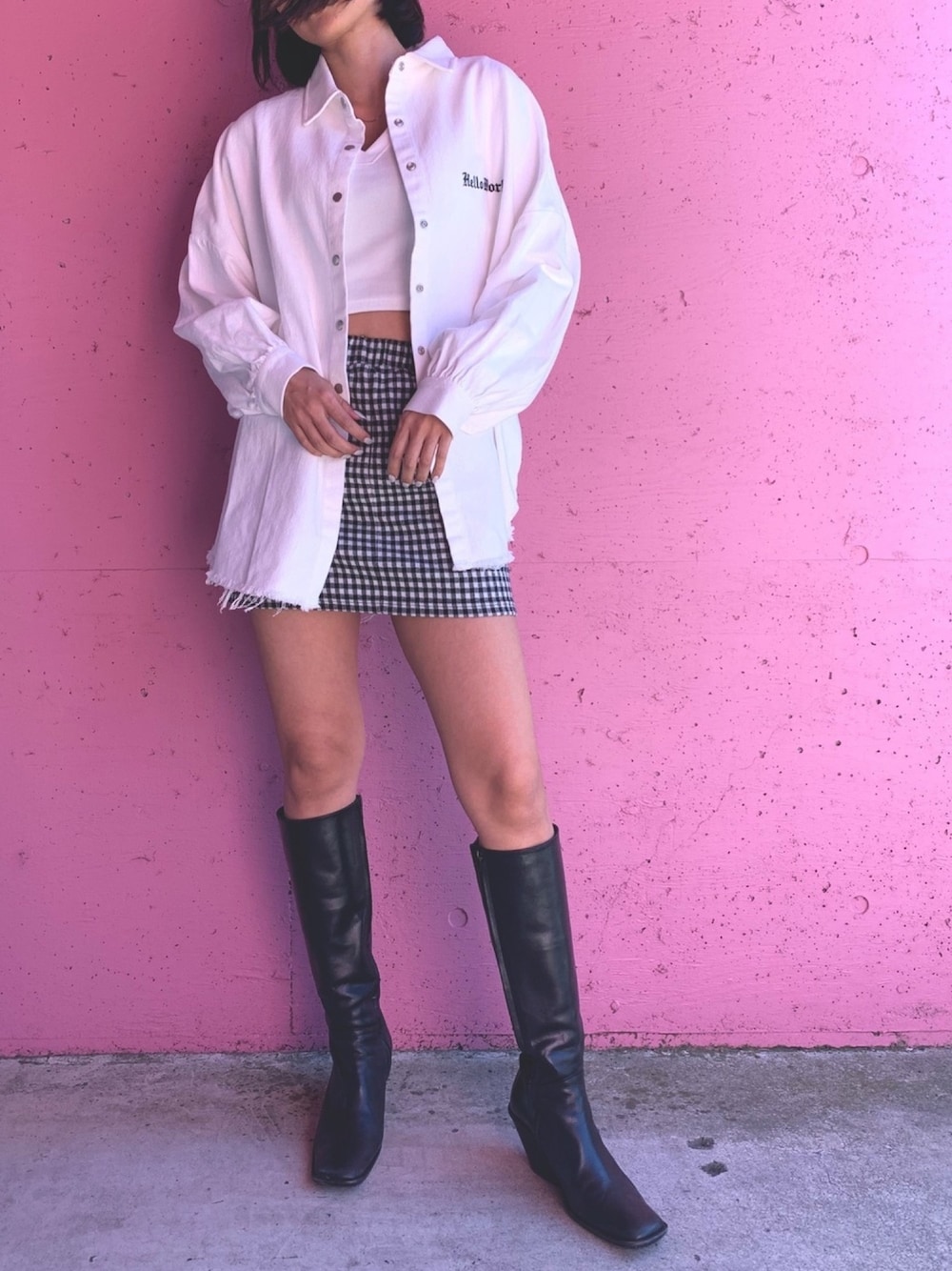 ギンガムチェックSKをダメージ加工のシャツやブーツで合わせて甘くなりすぎないようにしました💫 モノトーンコーデは大人っぽくなるので普段しない格好でも着やすい👌