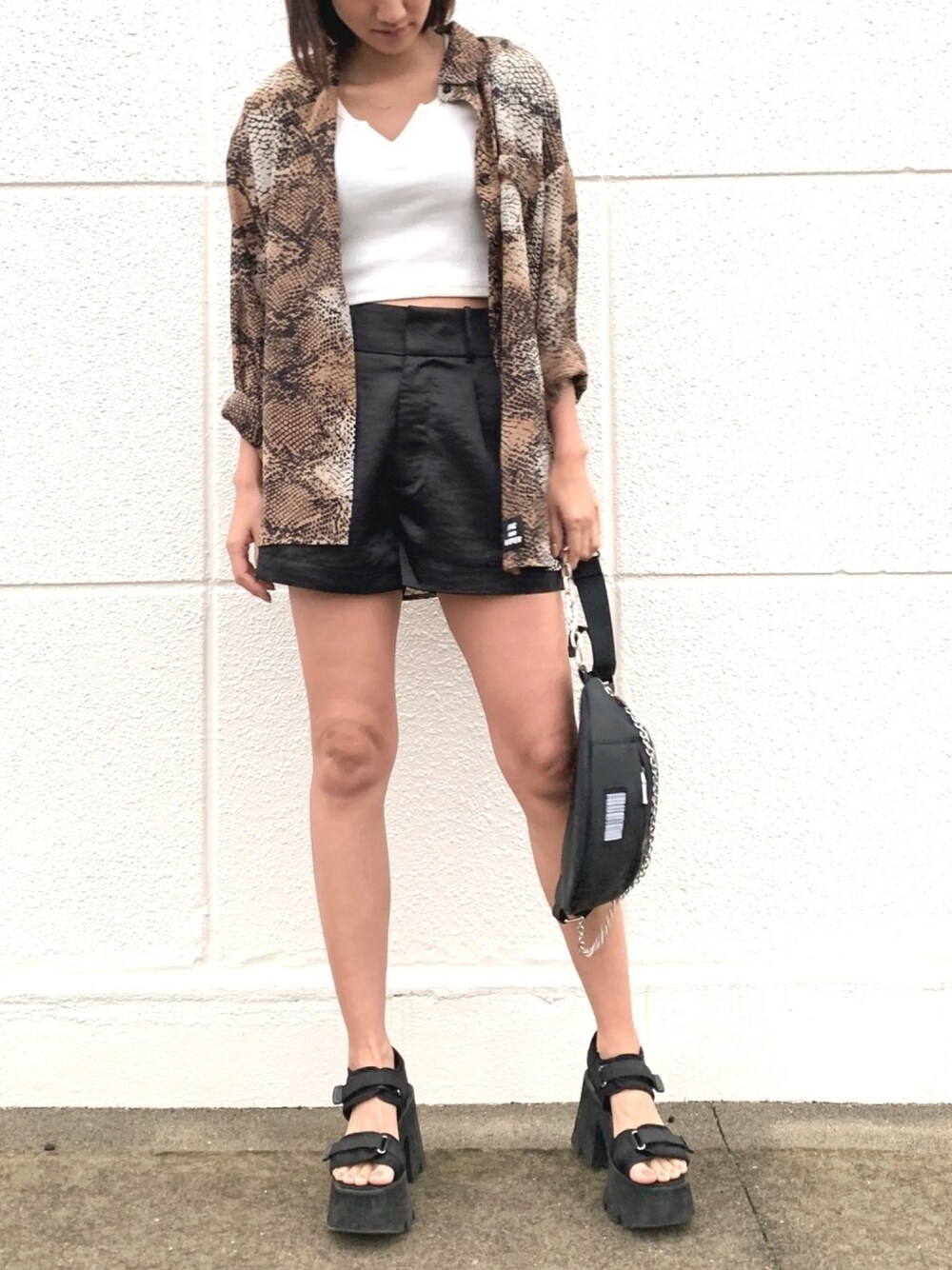 透け感あるシャツは柄がキツくならないから大人っぽい印象🧑 あわせをモノトーンでかっこよくしてみました👏 とにかく盛れる厚底は毎年履いちゃいます👡
