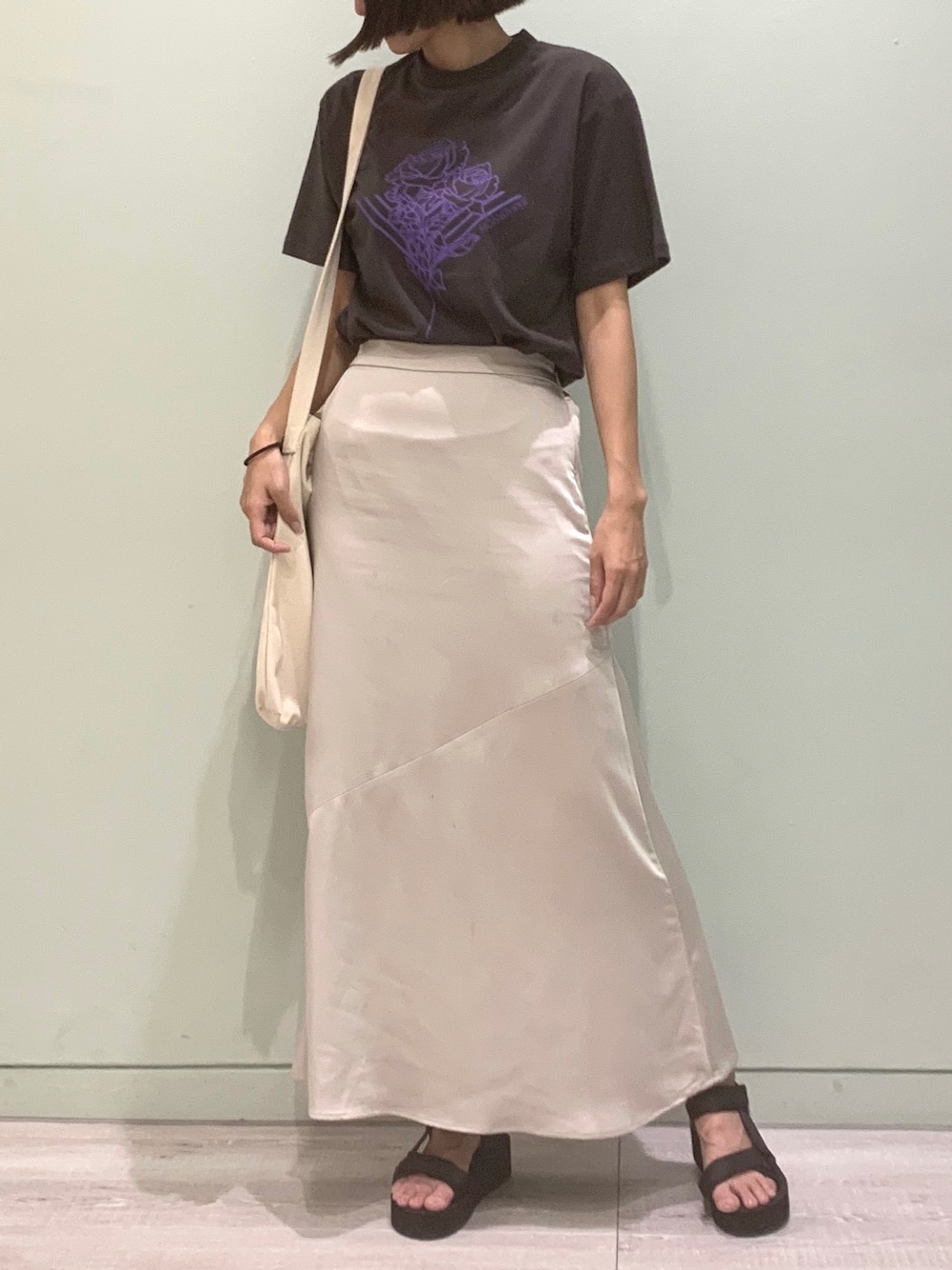 新作のTシャツはダークグレーにパープルのロゴが可愛いデザイン♡ サテンのフレアスカートで大人っぽく! サンダルは¥3,900+税ととってもお買い得👏