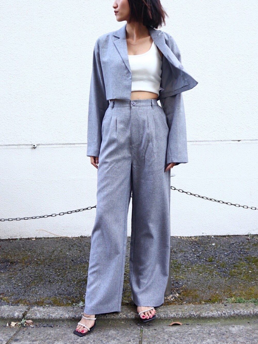 新作のセットアップ♡ 計算されたバランスが最高にかっこいい🔥 生地は薄手なのでパンツは特にすぐ着れちゃいます👌💓 JKはショート丈で袖が長め🤳 パンツはハイウエストでタックが入ってるのでラインが綺麗です😊😊