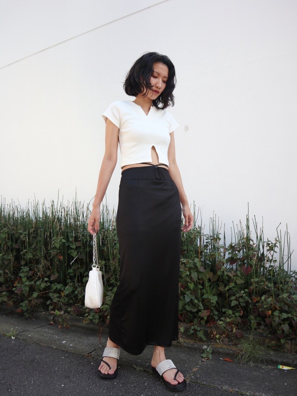 モノトーンコーデ🦨 ウエストにストラップのついた珍しいスカート♡ショートTOPSでチラ見せ出来る様に合わせました🍂 スタイルアップもできてお洒落にまとまりたす👍