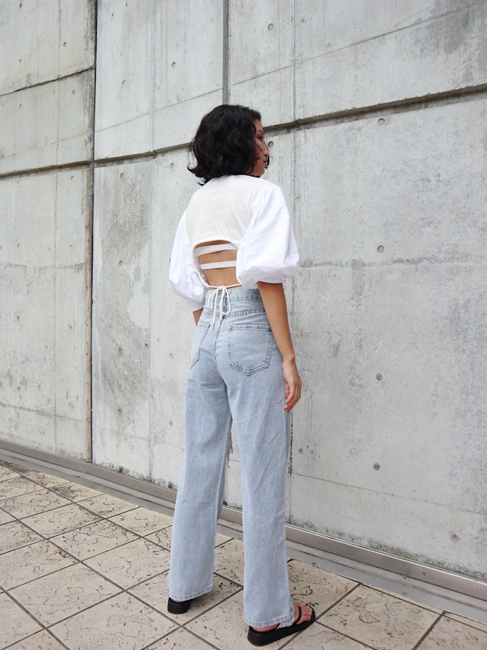 背中の開きと袖のボリュームが特徴のTOPS🍂少し涼しくなった日にちょうど良いコーデです✨ 前はシンプルなのでアクセじゃら付けしたい💍💎🎀