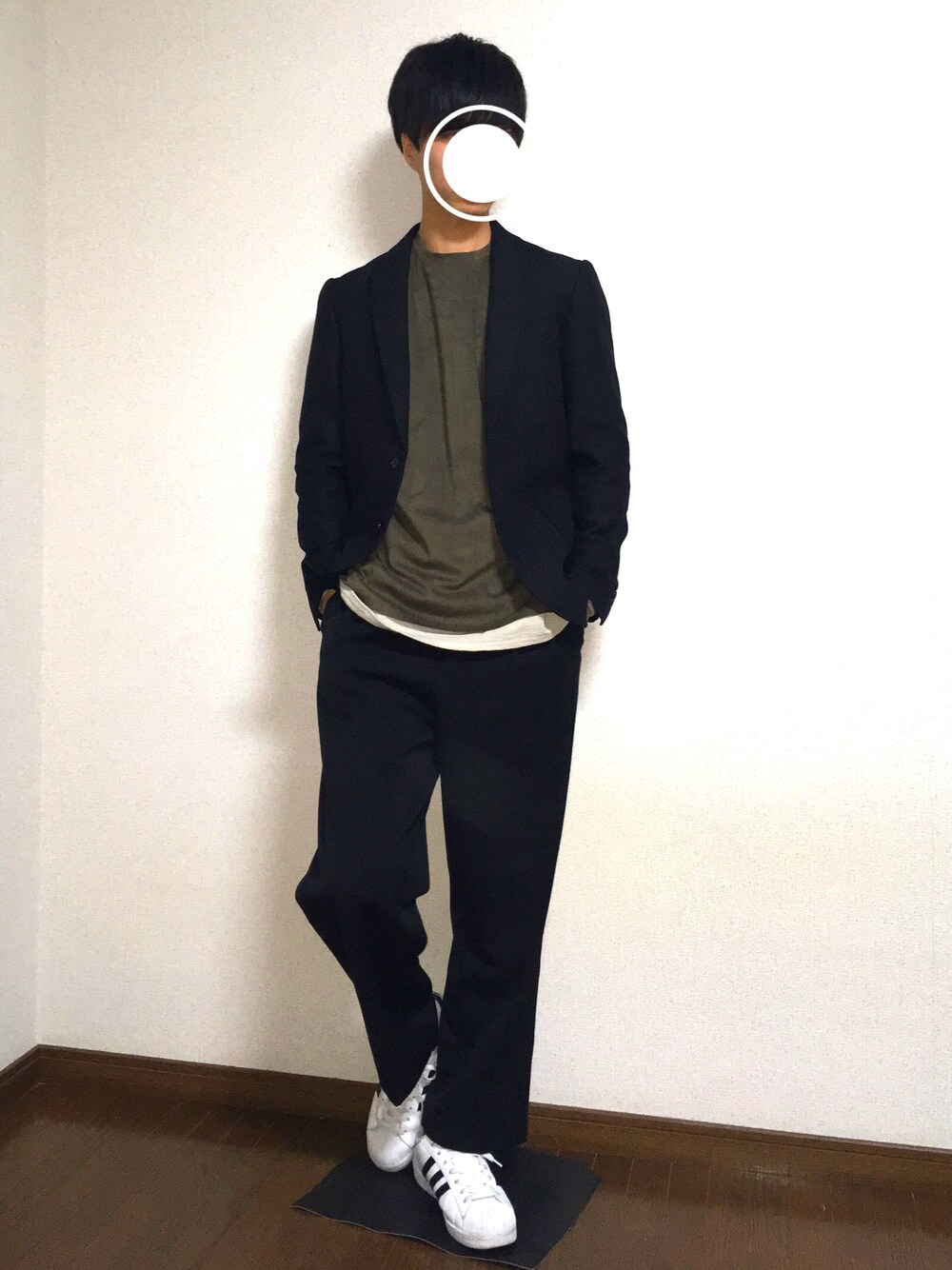 テーラードジャケットコーデ カーキ色のトップスやワイドパンツ、スニーカーできれい目になりすぎないよう崩しました