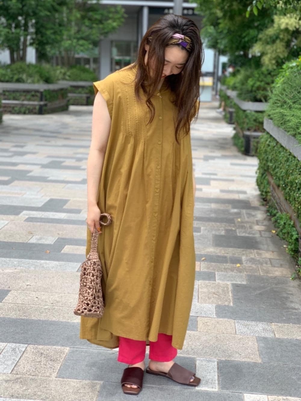 身長:157cm 着用サイズ:ワンピース(size FREE)パンツ(size 36) 華やかなカラーで合わせたお出かけスタイルです。 ワンピースは一枚でも短すぎない丈で、いろいろなコーディネートが楽しめます◎