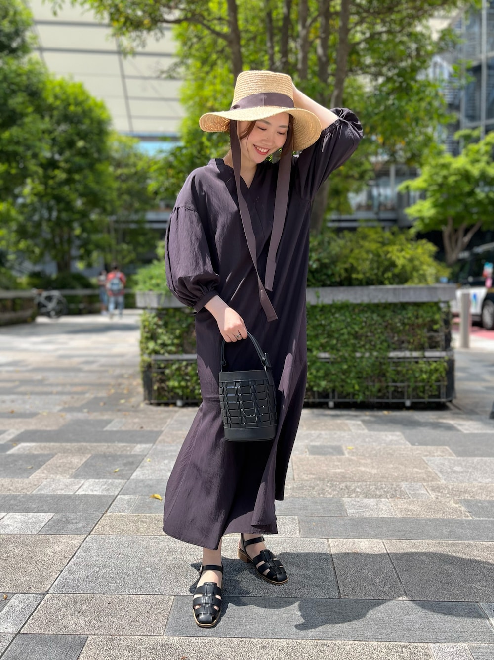 骨格ストレート|イエベ春 【サイズ感】 ワンピース:標準的 サンダル:標準的 【素材感・着心地】 ワンピース:柔らかく軽い着心地 【コーディネートポイント】 ブラックで統一したモノトーンスタイルです。 夏らしい小物で季節感を出しています。