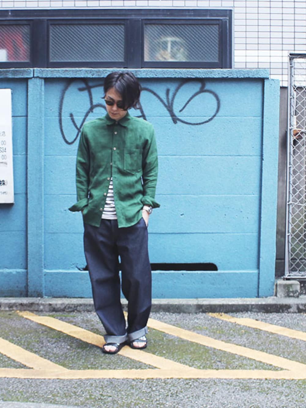 背面に特徴的な ギミックを配した FRAK LEDER/フランクリーダー のリネンシャツ。 夏らしい強いグリーンは ジメジメも吹き飛ばしてくれそうな エネルギーがこもっている。 向こう側が透けるような リネンの素材感は涼しげだ。 日差しの強い夏にこそ着たい一枚。 インナーは SAINT JAMES/セントジェームス の定番PIRIAC。 普遍的でありながら 時代によって表情を変える ボーダーTシャツ。 今年は少し大きめをざっくりと。 ワイドシルエットで リラックス感のある Yarmo/ヤーモ のデニムはウェストに 大きくシワをいれ ギュッと絞って穿く。 足元は今年街中でも 見かけることの多い シャワーサンダル。 VANS/バンズ 近所のコンビニへ行く感覚で 原宿や、新宿へ。 スポーツ系ブランドのも 持っているけど 穿き心地がいいのは ワッフル型ソールだからかな。 コンクリートの跳ね返しも強い 都会では サングラスも必須。 レンズの色はグリーンで 一応シャツとあわせたりしてみる。 スタッフDATA: 身長:約173cm 体重:約56kg ■シャツ フランクリーダー ''GREEN INKED''レギュラーカラーシャツ (0716024) 46,440円 着用サイズ:S 着用カラー:1.グリーン(48) ■Tシャツ セントジェームス ''ピリアック''ボーダーTシャツ (PIRIAC) 6,804円 着用サイズ:T5 着用カラー:4.NEIGE/TOURBE ■パンツ ヤーモ ''British Denim''デニムデッキパンツ (YAR-DECK-PANTS-DENIM) 27,000円 着用サイズ:M 着用カラー:1.インディゴ ■シューズ バンズ シャワーサンダル (SLIDE-ON-VN0004KIIX6) 5,940円 着用サイズ:US9(27cm) 着用カラー:1.ブラック ■メガネ モスコット ''レムトッシュ''サングラス (LEMTOSH-SUNGLASS) 32,400円 着用サイズ:M-46 着用カラー:3.ブロンド/グリーン http://item.rakuten.co.jp/smaclo/c/0000001323/
