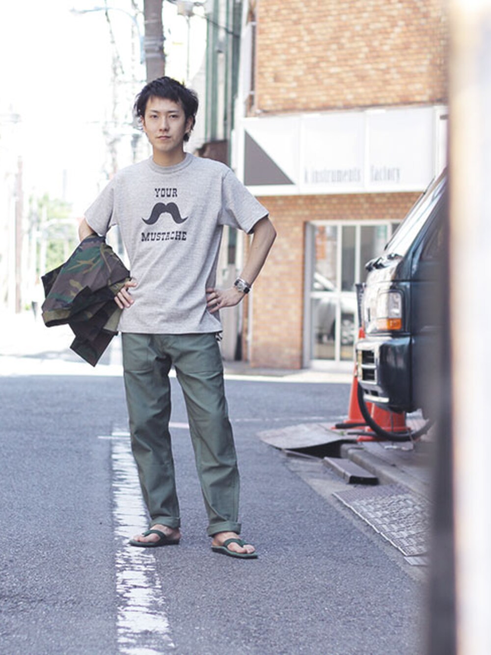 GUNG HOから ニューフィットが入荷したので 早速穿いてみた。 今回入荷したのは スリムフィットと テーパードフィット。 どちらも真新しさがあって どっちを穿くか迷ったけど 今回はスリムフィットの方に。 穿いてみると レギュラーモデルに比べ 股上が浅く 少しだけテーパード。 タイトとまではいかない すっきりとしていて 穿きやすいシルエットだ。 年齢やスタイルを問わず 幅広く活躍してくれそう。 まだ日本では ほとんど見かけない このニューフィット。 うちをきっかけに 扱うところが出てくるかも。 なんて思ったり。 手に持ったのも 同じく GUNG HO ファティーグジャケット。 腰に巻いてもいい。 トップスは WAREHOUSE の盛夏から 口ひげが描かれた プリントTシャツ。 横ムラと杢の入り方が秀逸。 未だにここに追いつくクオリティの ムラボディは見当たらない。 今回はワンサイズアップで Lサイズを着てみました。 足元は ISLAND SLIPPER スウェードサンダル。 夏なのでアクセサリーも 新調してみては? CANDY DESIGN & WORKS からホテルのキーホルダーを モチーフにしたもの。 大型のピンはキーフックとして。 店頭のみで販売しています。 スタッフDATA: 身長:約173cm 体重:約56kg ウエアハウス ''YOUR MUSTACHE''Tシャツ (16MS-4601-YOUR-MUSTACHE) 5,940円 着用サイズ:L 着用カラー:5.杢グレー ガンホー スリムフィット ファティーグ ベイカーパンツ (GUNG-4PK-SLIM-1301SF) 8,640円 着用サイズ:30 着用カラー:1.オリーブサテン ガンホー 2ポケット ファティーグジャケット (GUNG-CAMO-2PK-JKT-1050J) 8,640円 着用サイズ:M 着用カラー:1.ウッドランドカモ アイランドスリッパ ''ブラックソール''スウェードサンダル (PB203-SUEDE) 15,984円 着用サイズ:US8(約26cm) 着用カラー:1.FOREST-GREEN-SUEDE キャンディ デザイン&ワークス ''COOPER''キーホルダー (CK-15-COOPER) 5,184円 着用サイズ:FREE 着用カラー:2.ブラス http://item.rakuten.co.jp/smaclo/c/0000001328/