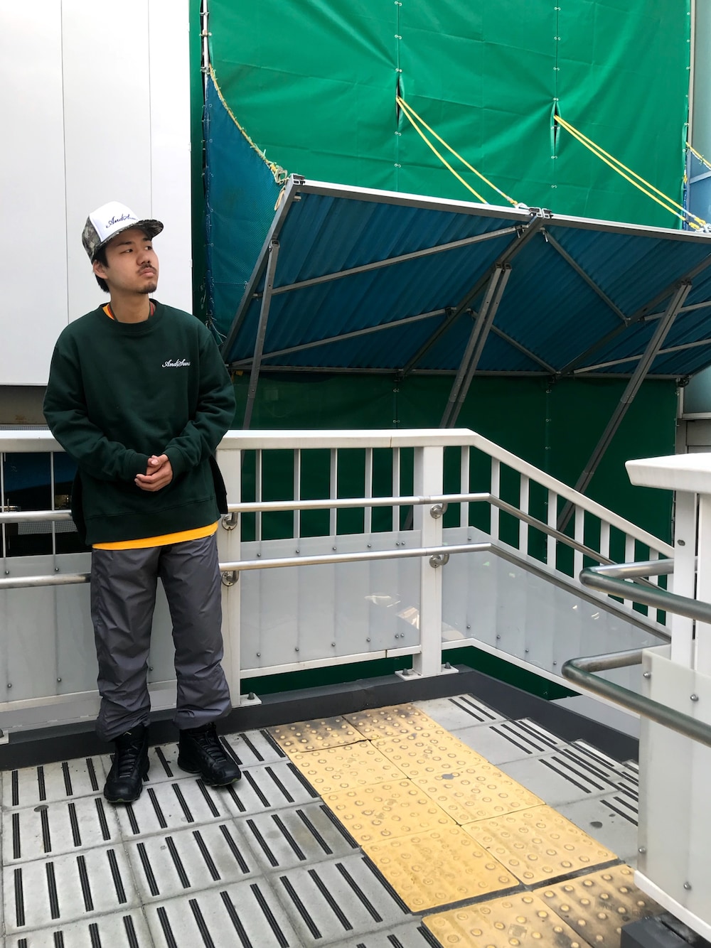 ANDSUNS Shibuya Staff: Shota CAP: CLASSIC SUNS MESH CAP Tops: CLASSIC SUNS CREWNECK PANTS: SUNS NYLON SHELL PANT Shoes: Jordan13