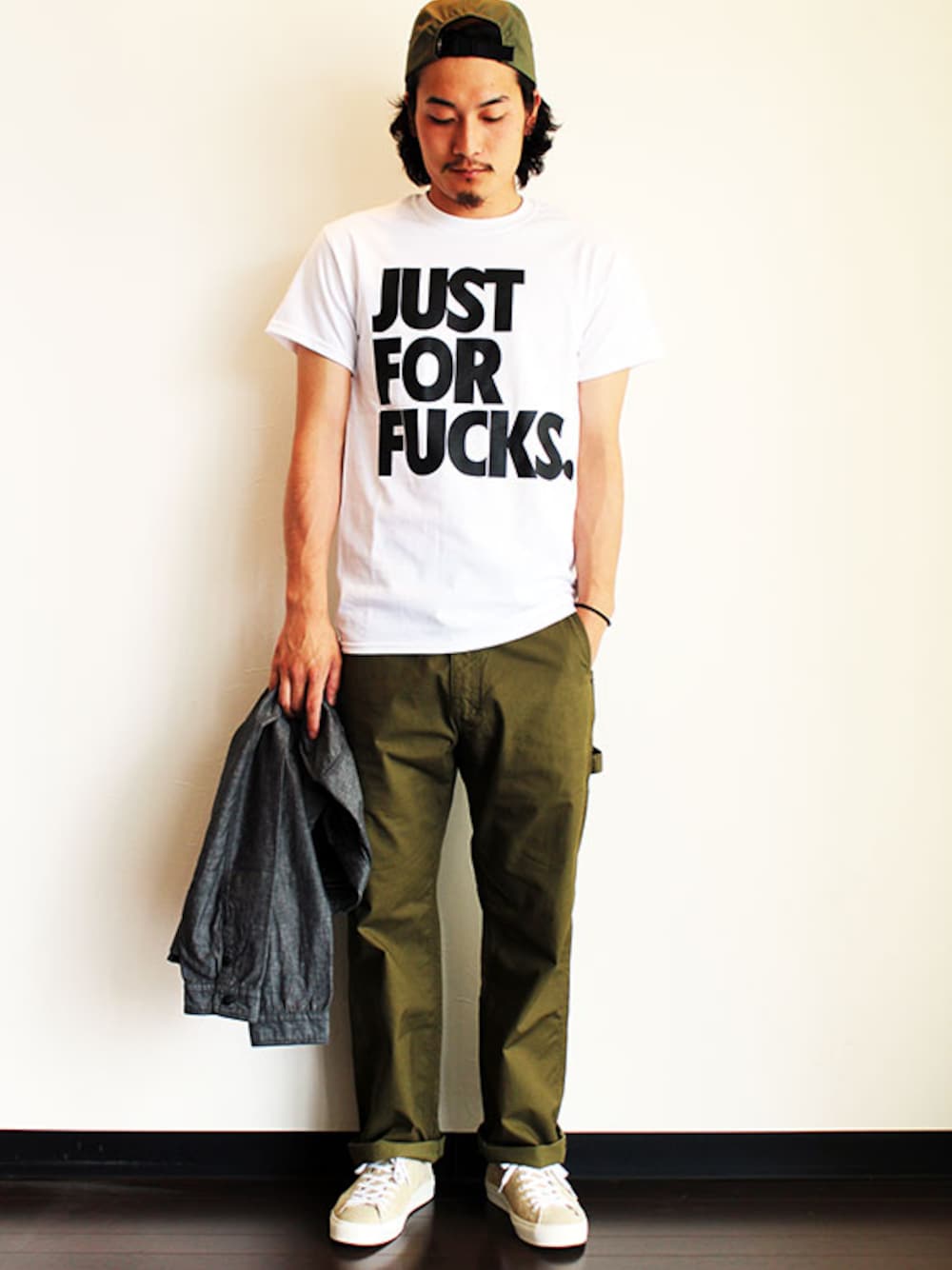 [モデル 174cm 62kg 足サイズ 27cm ] CAP : THE STAKE (ザ・ステイク) " 5 PANEL CAP " UV PROTECTION SHIRT : THE FABRIC (ザ・ファブリック) " KATANA " CHAMBRAY (サイズL着用) TEE : THE STAKE (ザ・ステイク) " JUST FOR FUCKS " TEE (サイズM着用) PANTS : THE FABRIC (ザ・ファブリック) " CHINO PAINTER " (サイズS着用) SHOES : UNITED LOT. (ユナイテッド ロット.) " Tennis Sneaker " (サイズS着用)