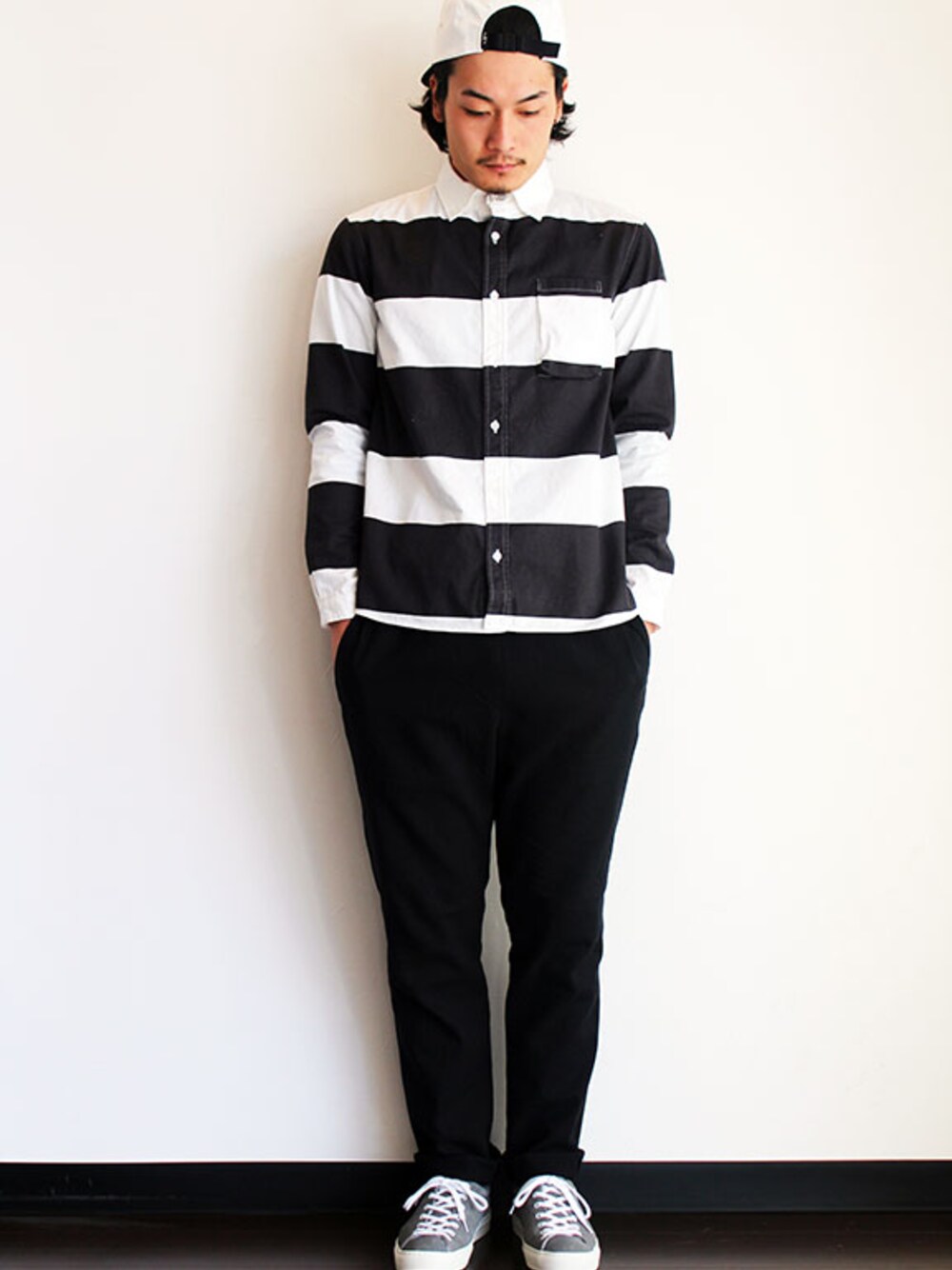 [モデル 174cm 62kg 足サイズ 27cm ] CAP : THE STAKE (ザ・ステイク) " 5PANEL CAP " two-tone TOPS : LOLO (ロロ) プリントボーダー B.D シャツ (サイズM着用) PANTS : HEALTH (ヘルス) " EASY SLACKS " (サイズM着用) SHOES : UNITED LOT. (ユナイテッド ロット.) " Tennis Sneaker " (サイズS着用)