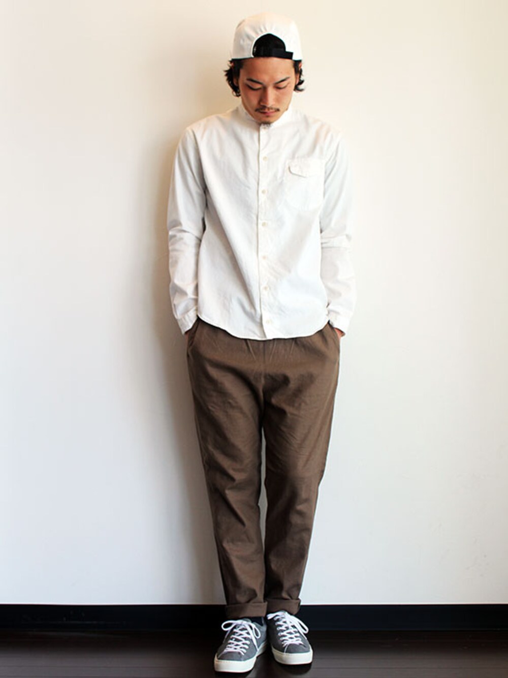 [モデル 174cm 62kg 足サイズ 27cm ] CAP : THE STAKE (ザ・ステイク) " 5PANEL CAP " canvas TOPS : LOLO (ロロ) スタンドカラー シェイプシャツ (サイズL着用) PANTS : HEALTH (ヘルス) " EASY SLACKS " (サイズM着用) SHOES : UNITED LOT. (ユナイテッド ロット.) " Tennis Sneaker " (サイズS着用)