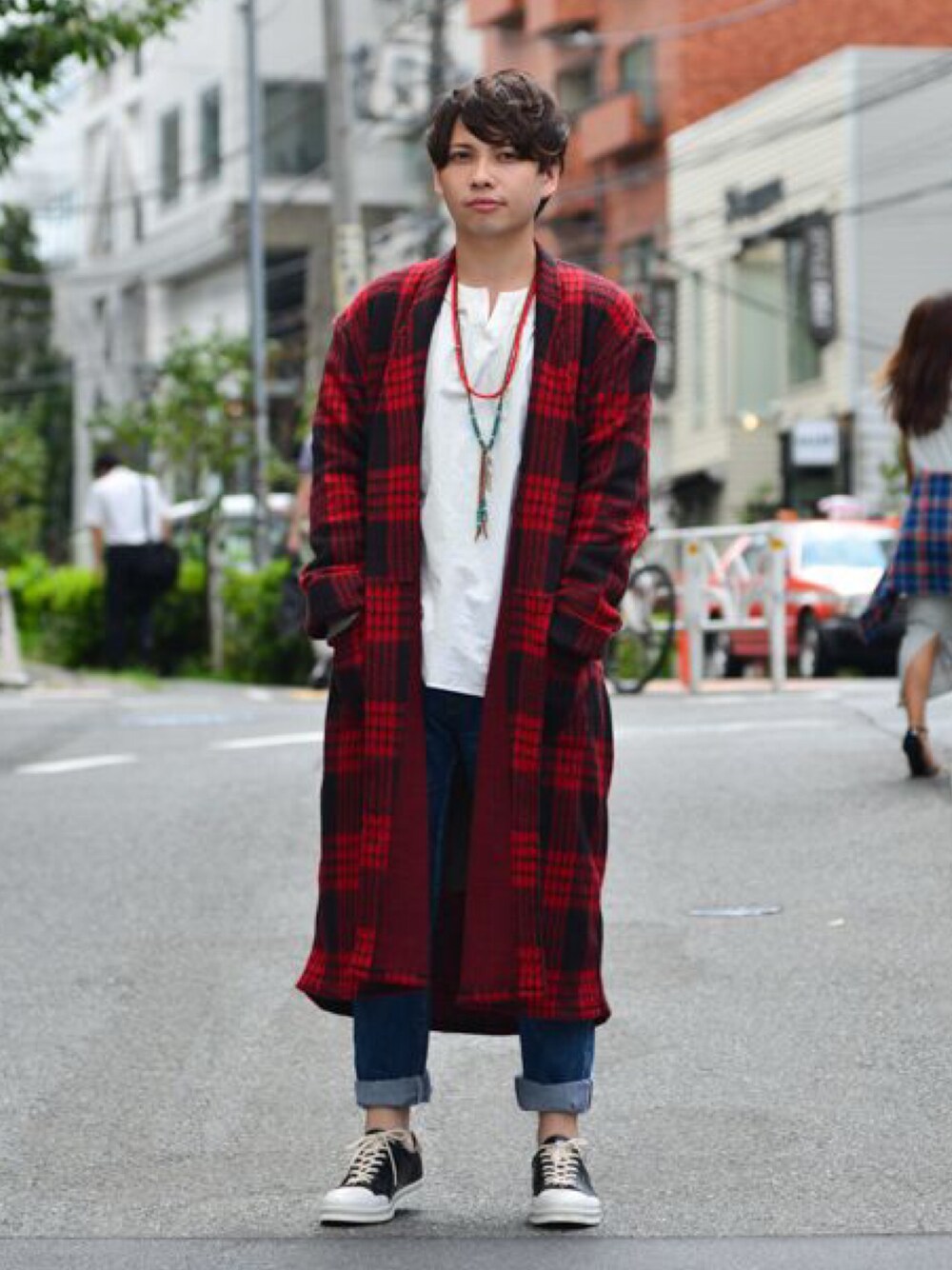 着丈の長いチェックガウンには、ロールアップにスニーカーのラフスタイル。