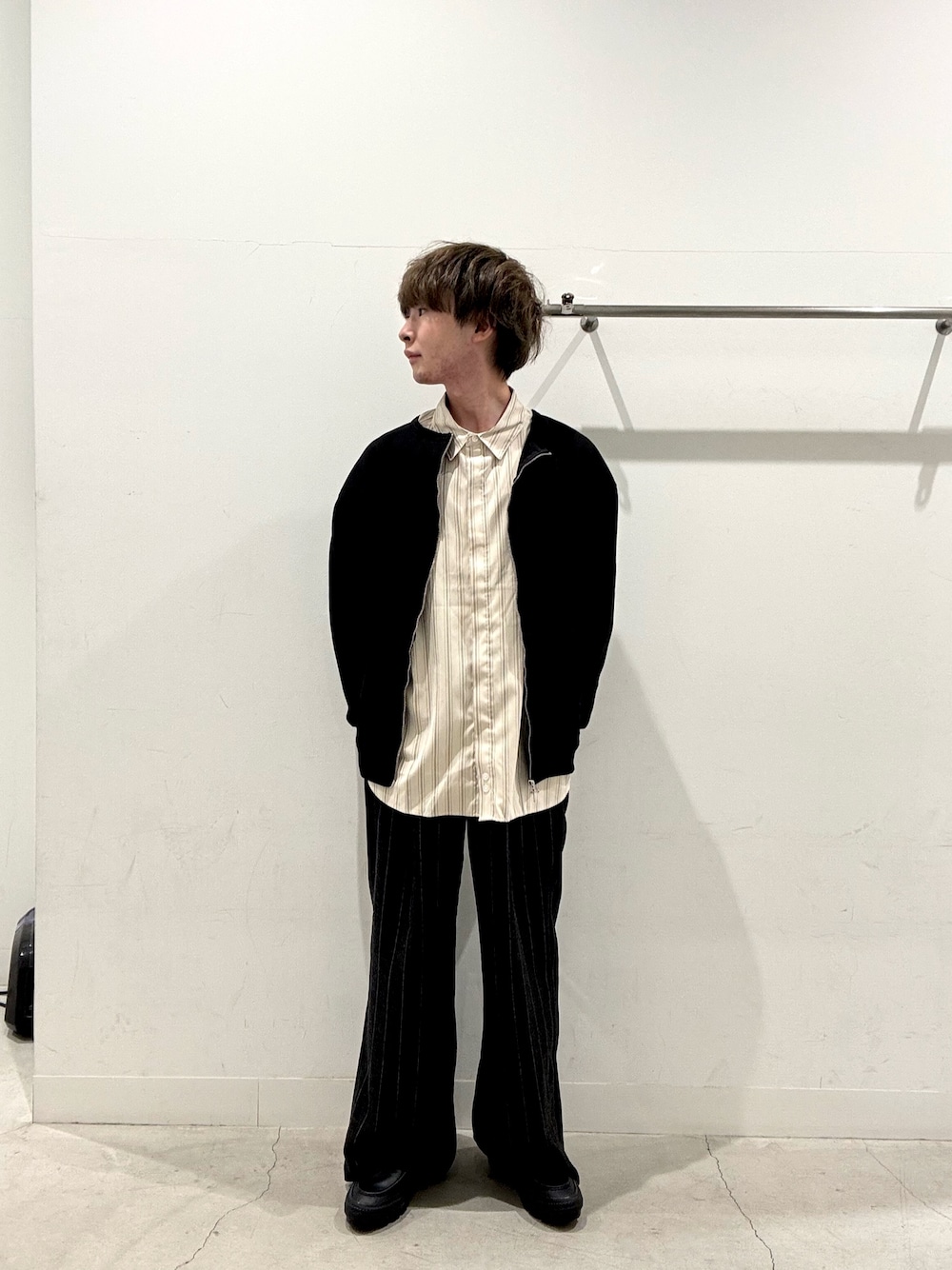 ご覧いただきありがとうございます! 襟付きのストライプのシャツにクルーネックジップスウェットを羽織って、フレアパンツで合わせてみました! ぜひお試しください!