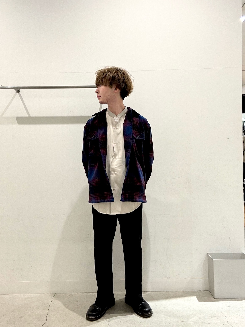 ご覧いただきありがとうございます! バンドカラーシャツにパープルのネルチェックシャツを合わせてみました!テーパードパンツを履くことできれいめにまとめることができます! ぜひお試しください!