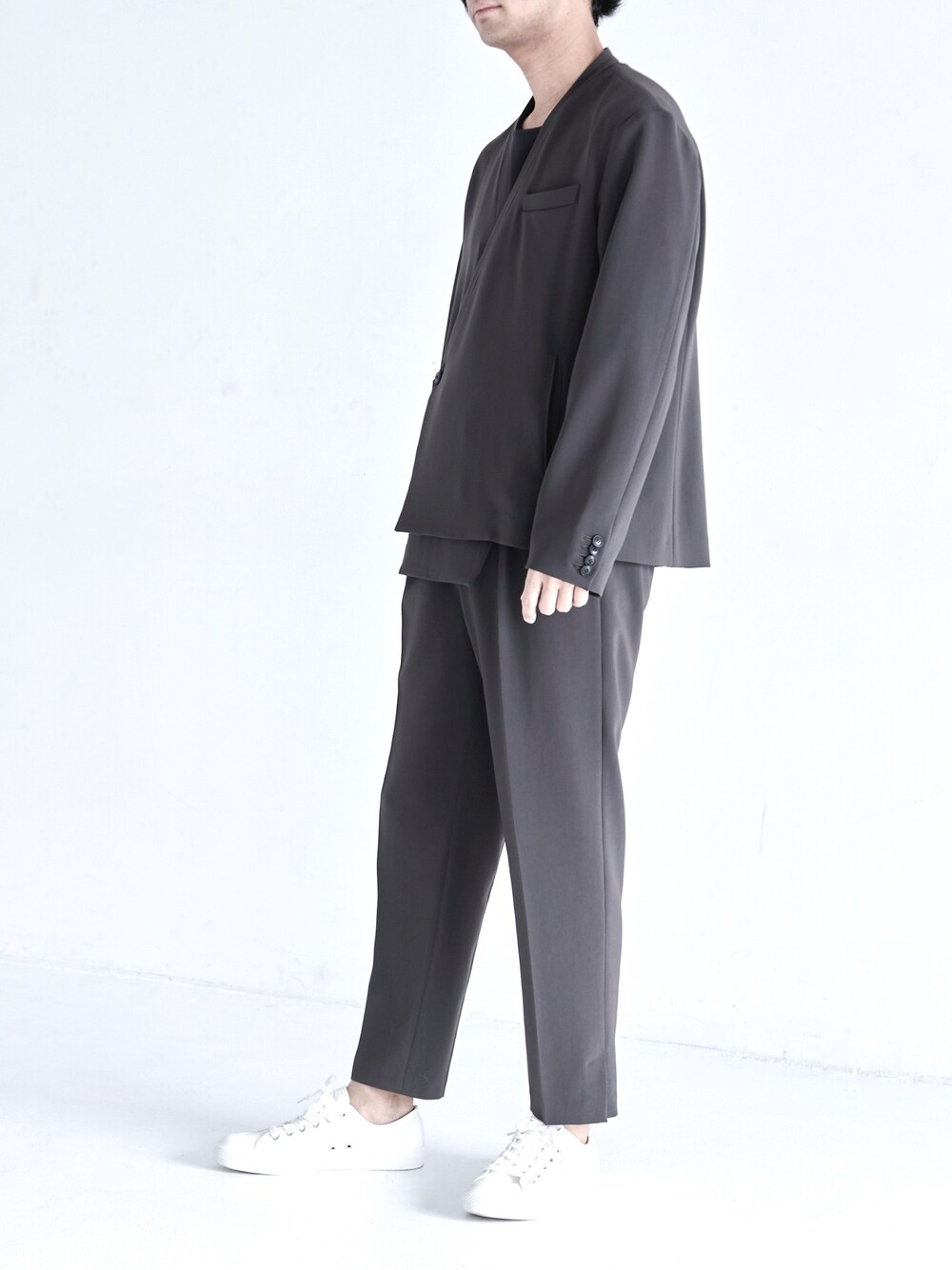 Andyのノーカラージャケット「しっかりとした伸縮性ある生地を使用しており、 軽く、快適に着ることができます。 和服のエッセンスを取り入れたシンプルかつ 機能美溢れるデザインで、きちんと感とリラックス感を バランスよく取り入れました。オンラインミーティングの際にさらっと羽織ったりセットの星影踊るテーパードパンツと合わせて上品に着ることもできます。」を使ったコーディネート