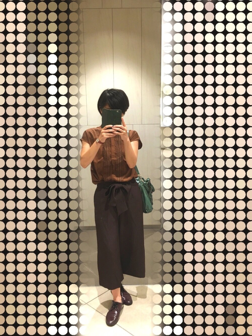 Hello!! 秋っぽさ先取りです。 同系色でまとめました。 光沢のあるトップスにリボン付きのガウチョで。 シャツ: ジョーゼットブラウス パンツ: リボンサッシュ付きガウチョ シューズ: オックスフォードシューズ