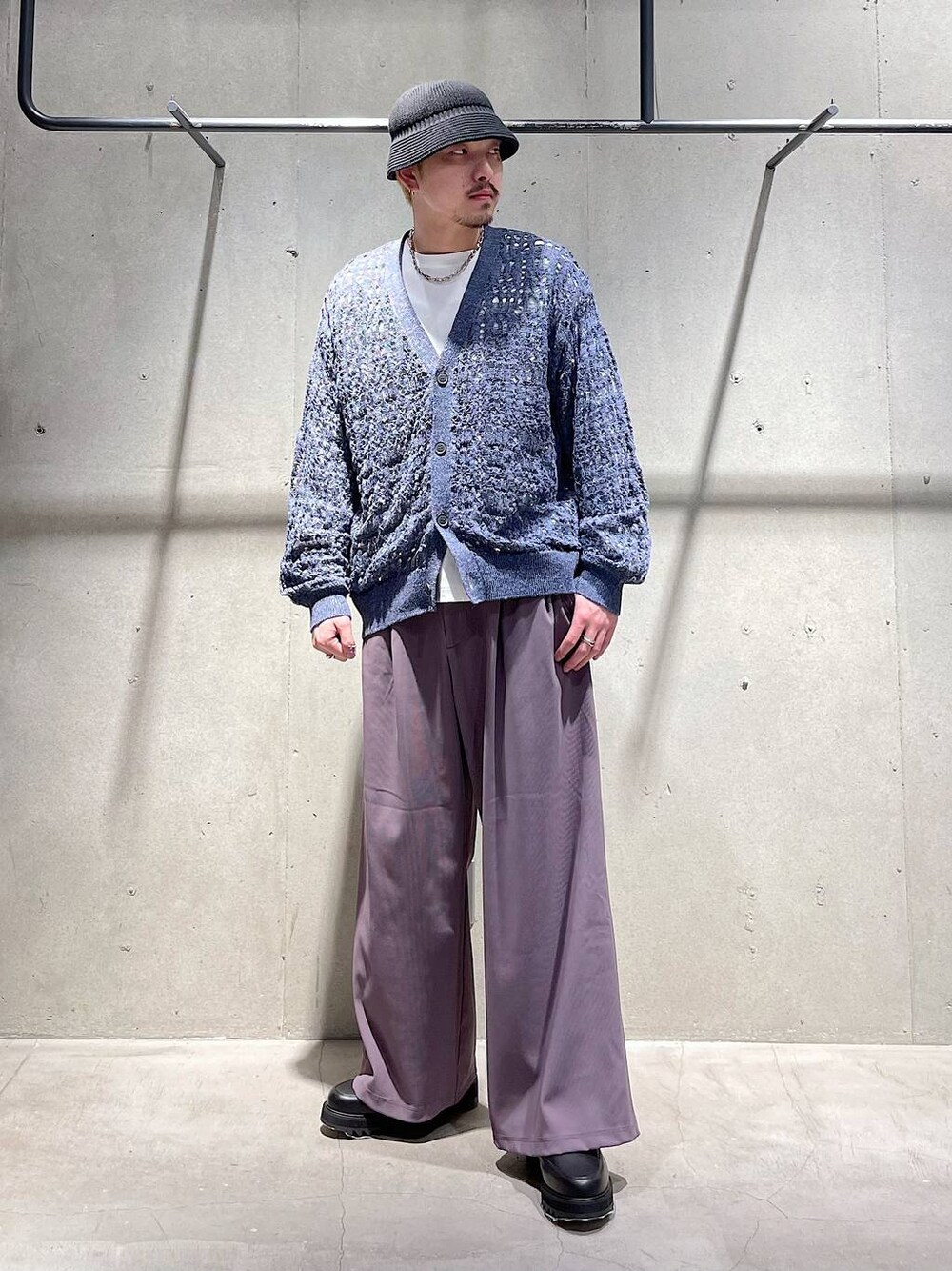 春、夏のカジュアルコーデ ランダムにダメージが入ってある透かし編みのニットカーディガンです! 生地は少し光沢感があるのでキレイめ見えする一枚で存在感のあるアイテムです! 分厚すぎず薄すぎない生地感が通年使えるのでとても万能なアイテムです! パンツはプリーツの素材感になっているワイドパンツです! キレイめな印象で履けるのはもちろんですが伸縮性もあるので履いててとても楽なパンツです! 着方がわからない等あればDMや HARE渋谷店でお待ちしてます! Instagram→