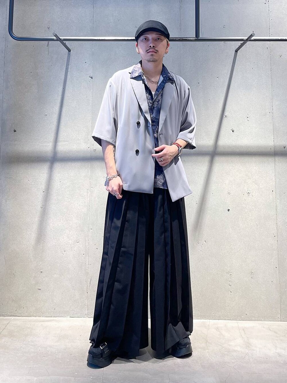 夏の個性派ジャケットコーデ トップスはトレンドのシアー素材になっている柄シャツです! 花柄は大人っぽい印象で着れて上品な印象なのでシアーの透け感ととてもマッチしています! ジャケットは夏に使えるテーラードジャケットです! オーバーサイズでゆるく着れるのでフォーマルなイメージのジャケットではなくラフに着れるのがポイントです! パンツは超極太のハカマ風プリーツパンツです! 裾に向かって大きく開けてるシルエットは他ではないシルエットになります! 通年履ける素材なのでどんなスタイルにも合わせれます! 着方がわからない等あればDMや HARE渋谷店でお待ちしてます! Instagram→