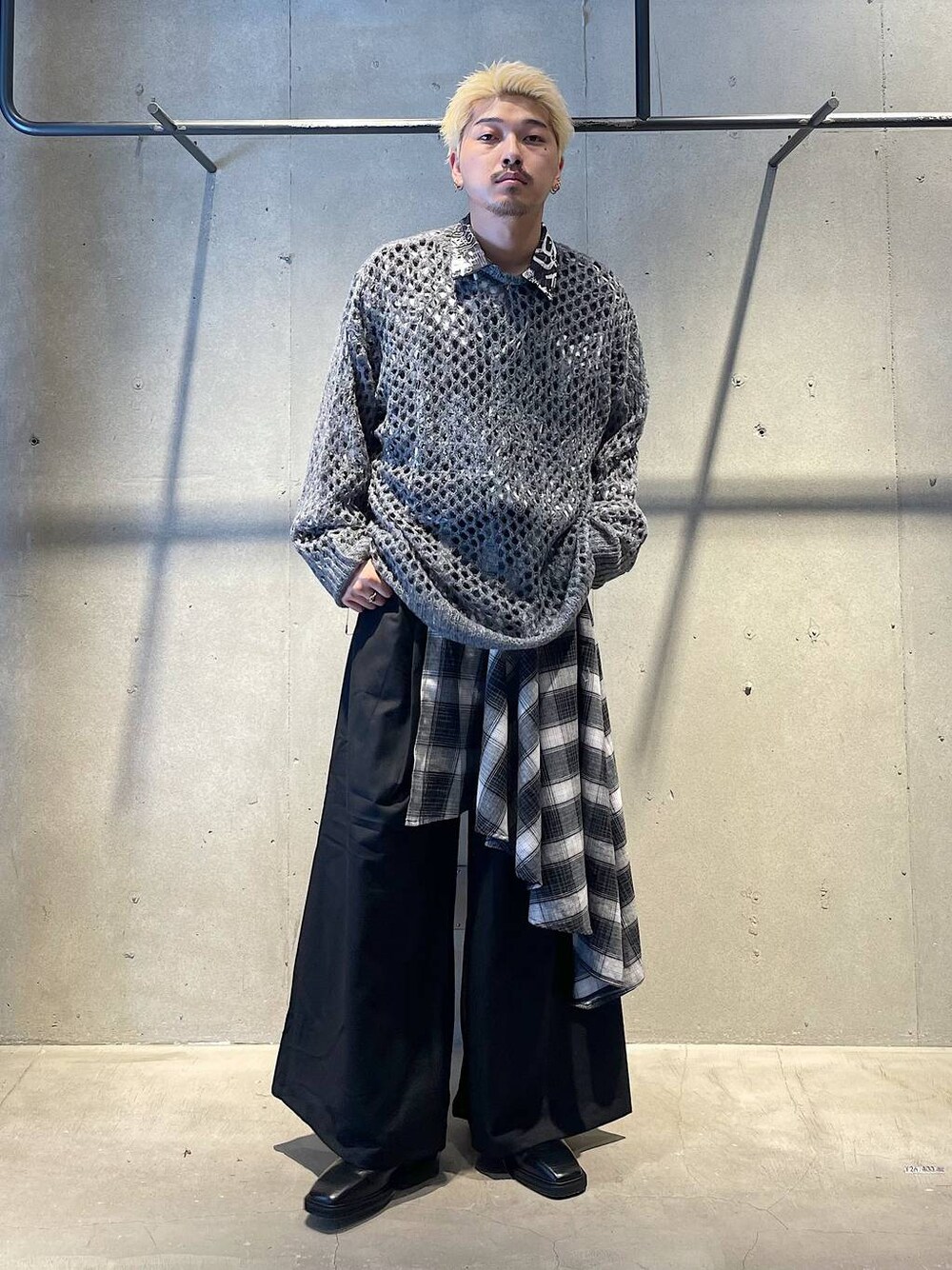 秋の個性派キレイめコーデ トップスはトレンドのメッシュニットです! 毛足が長いモヘア生地なので季節感が出せます! インナー変えるだけで色々な見え方になるのでスタイリングの幅が広くなります! シャツはウォールアートを全体にあしらったデザインのオーバーサイズなシャツです! ダークで色気な印象のあるデザインは普段のHAREよりもよりモードな印象になります! ところどころにシルバーパーツのデザインがあり1枚でも存在感のあるアイテムです! パンツはチェックシャツを腰に巻いてあるようなデザインのワイドパンツです! パンツのシルエットはしっかりワイドなので楽に着れます! スタイリングにワンポイント欲しいときに便利なアイテムです! 着方がわからない等あればDMや HARE渋谷店でお待ちしてます! Instagram→