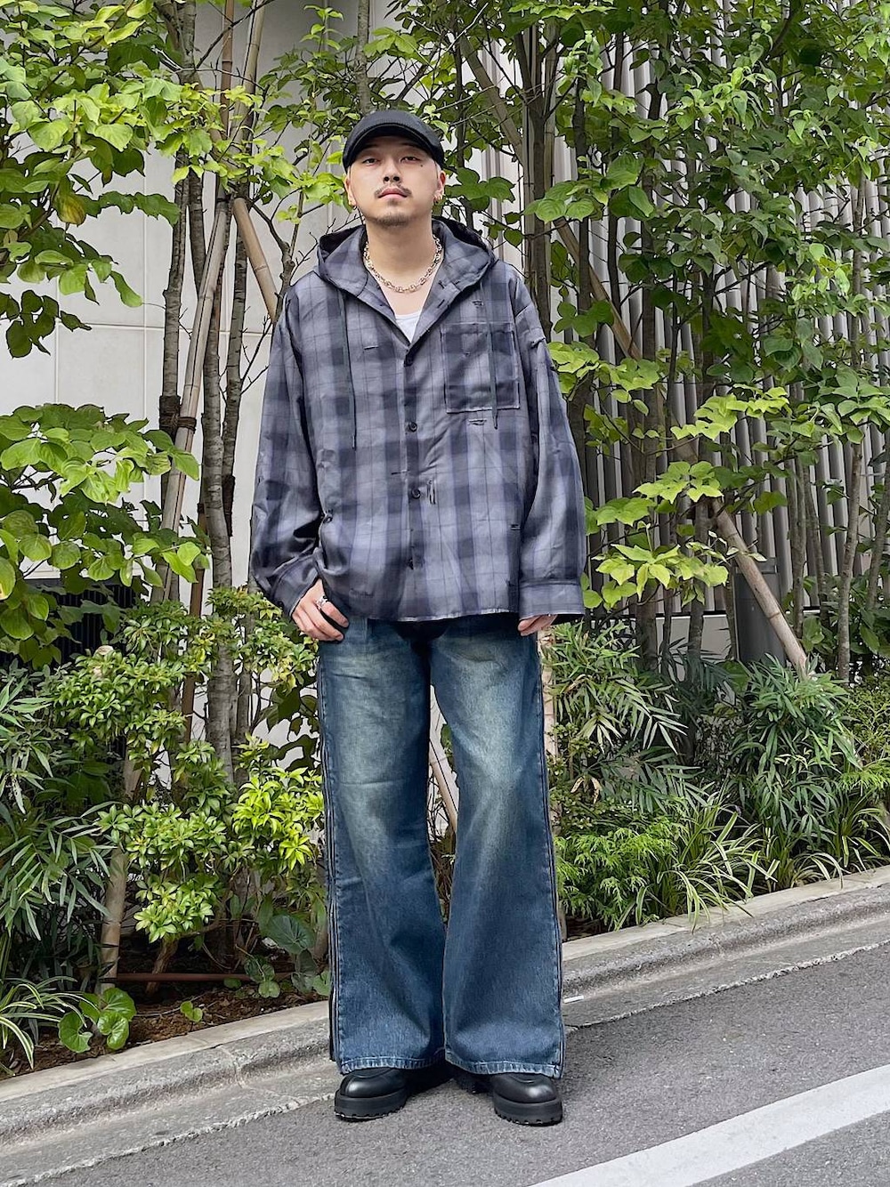 カジュアルコーデ チェック柄のシャツフーディーは他のチェックシャツと違い差別化できて存在感のあるアイテムです! デニムパンツと合わせてよりカジュアルな印象にしたスタイリングです! 着方がわからない等あればDMや HARE渋谷店でお待ちしてます! Instagram→