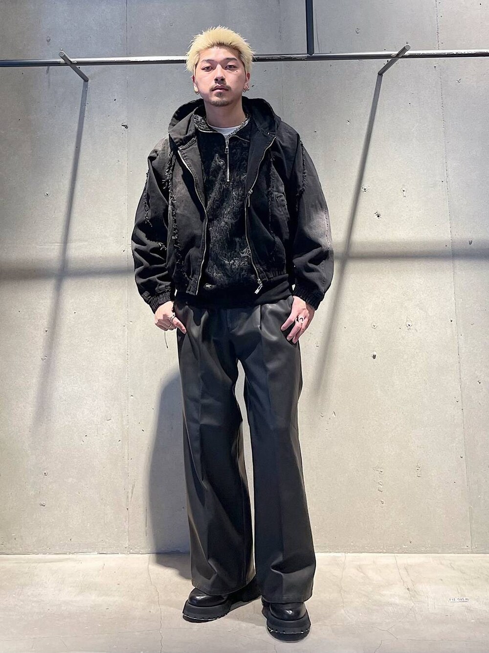 冬のオールブラックコーデ アウターはフードが付いたデニムブルゾンです! 丈が短く身幅が広い仕様になっていて今っぽいボックスシルエットで着れます! カジュアルなスタイリングにももちろんスラックスなどにも合うのでオススメです! パンツはHARE定番のレザーワイドパンツです! 程よくゆったりしたワイドシルエットがとても合わせやすくレザーの素材感も程よくしっかりめな分厚さなので立体感があり綺麗にパンツを見せてくれます! 着方がわからない等あればDMや HARE渋谷店でお待ちしてます! Instagram→