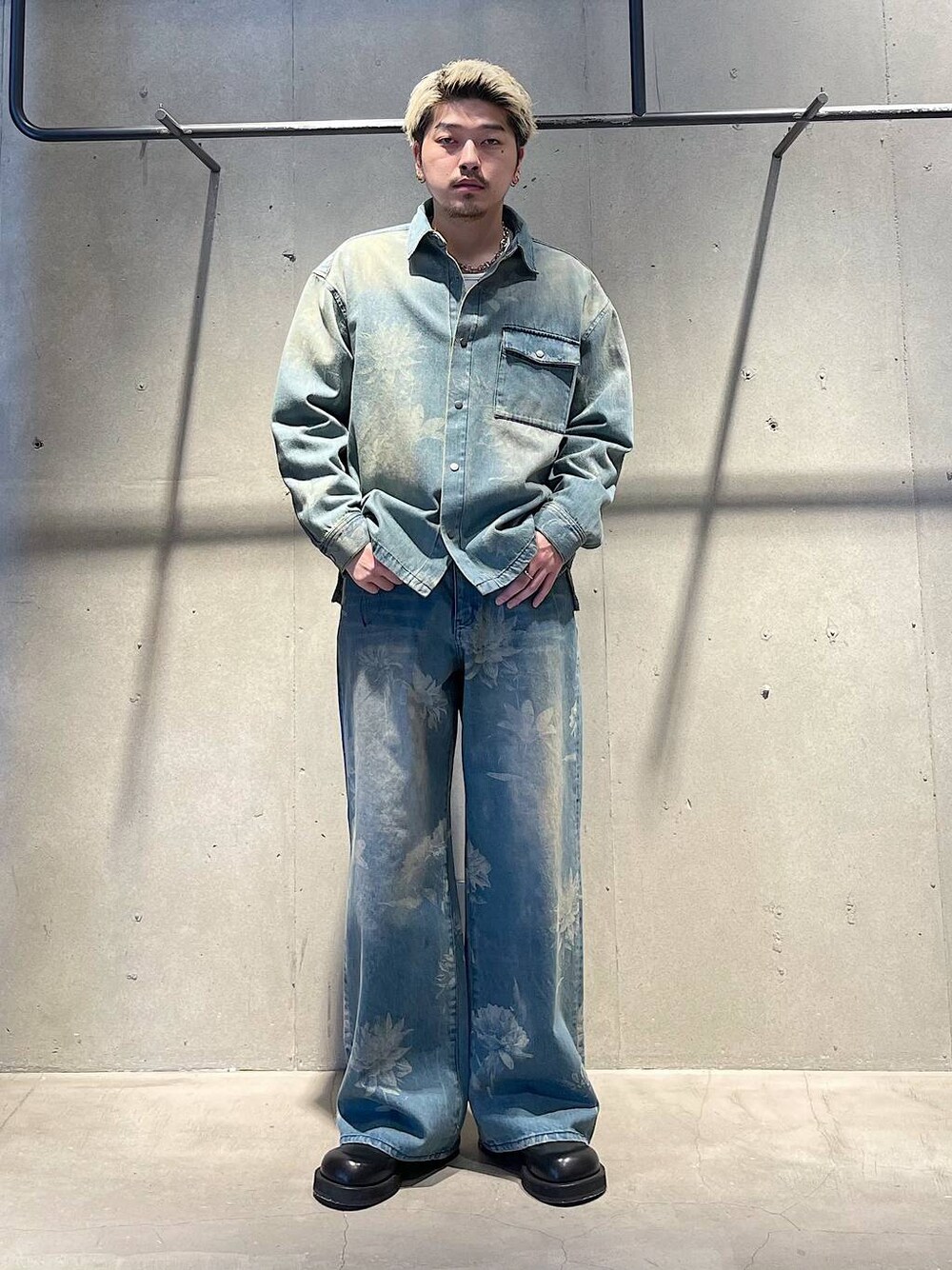 春のデニムセットアップコーデ どちらも花柄のプリントが全面に施されていてどこから見ても存在感のあるセットアップです! 着方がわからない等あればDMや HARE渋谷店でお待ちしてます! Instagram→