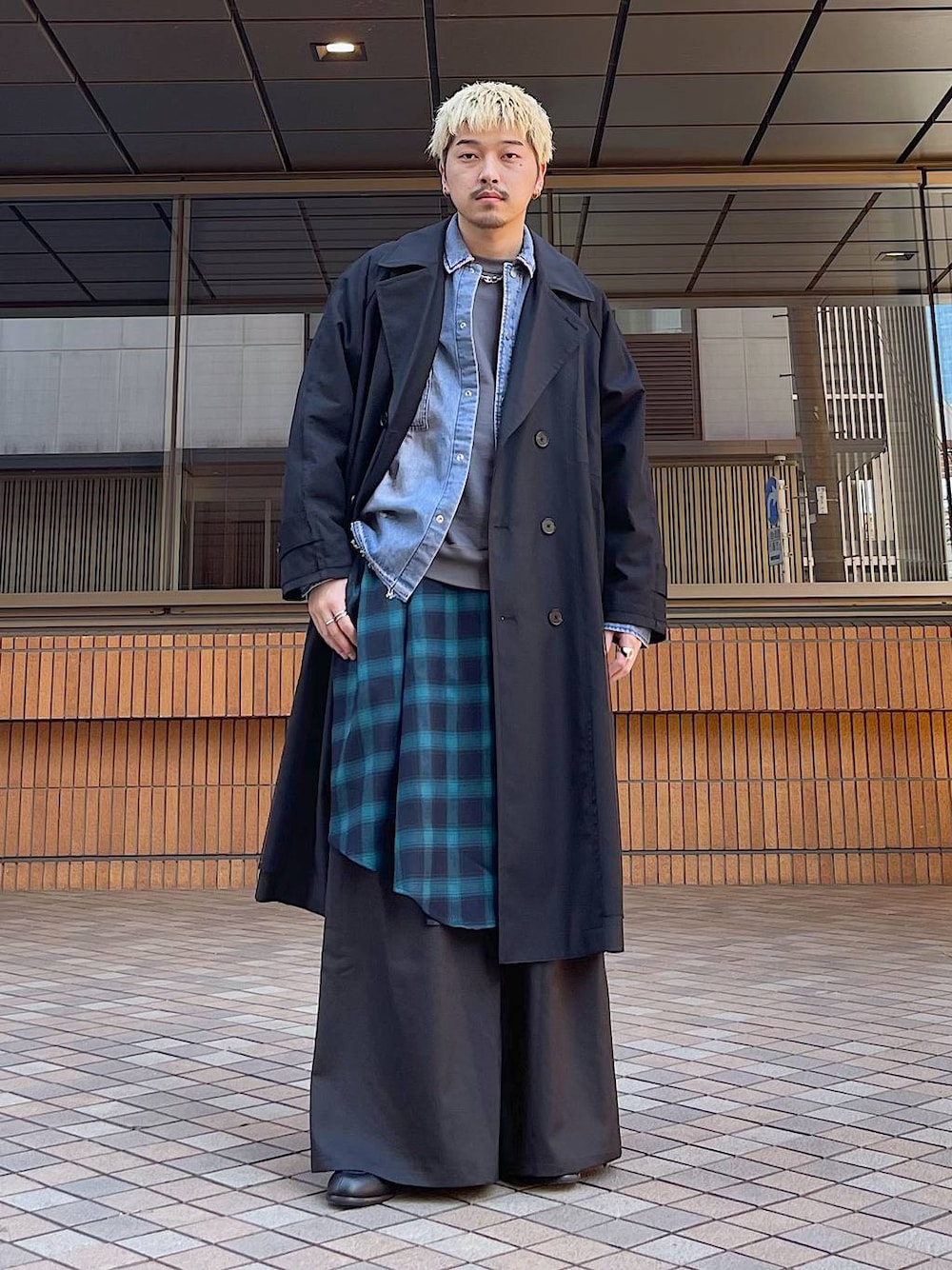 春の個性派コートコーデ ロングコートに合わせてデニムのシャツとスカートパンツを合わせたコーディネートです! 着方がわからない等あればDMや HARE渋谷店でお待ちしてます! Instagram→