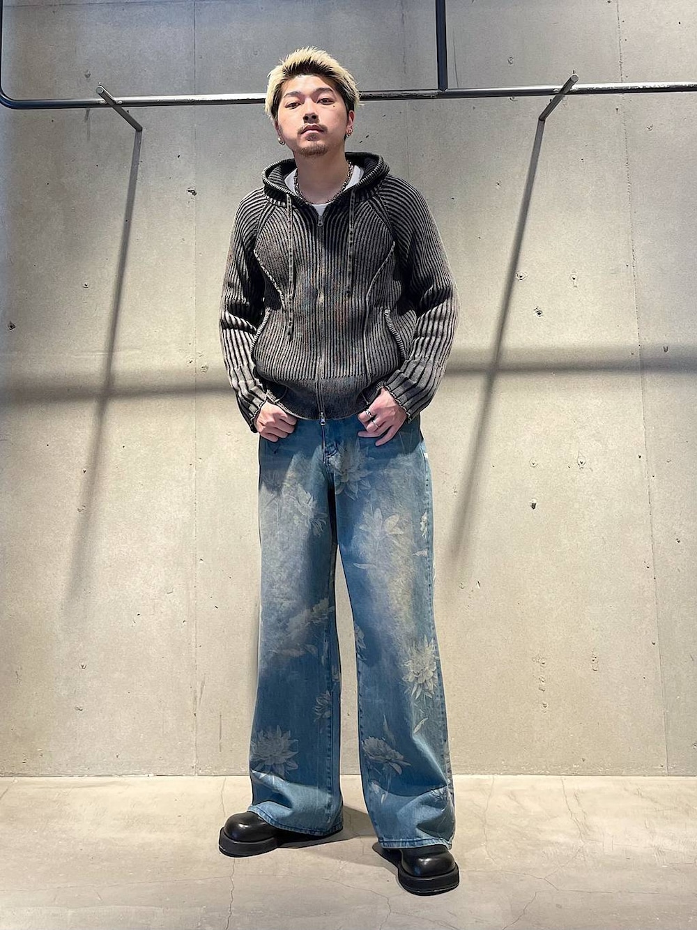 春のカジュアルコーデ ニットフーディーとデニムパンツの合わせはとても相性がよく色々なスタイリングにも使えます!
