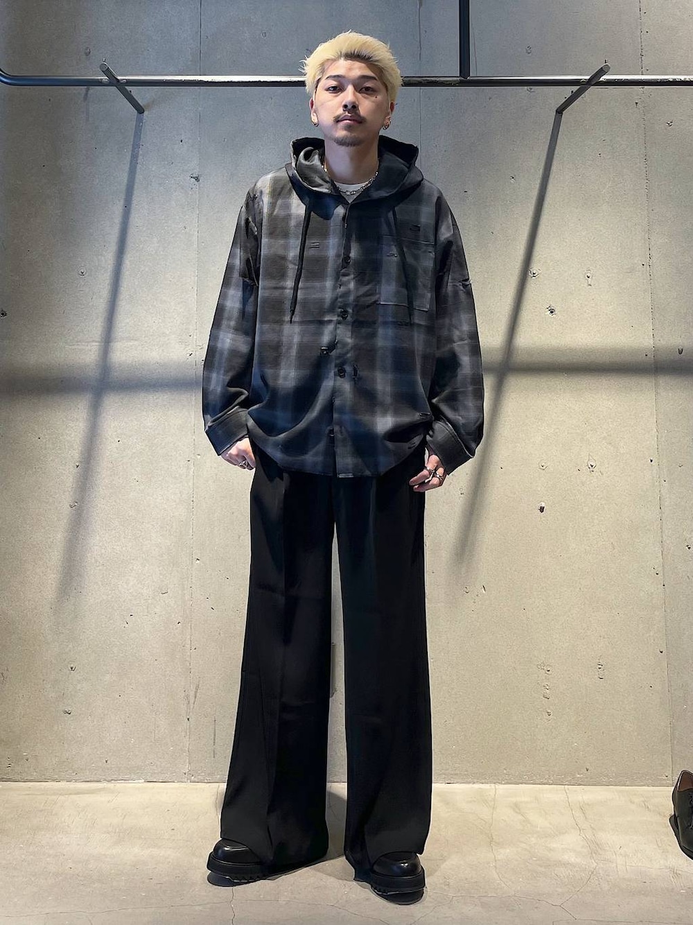 春のカジュアルコーデ チェックシャツパーカーにワイドのスラックスでとてもシンプルなコーディネートです! トップスの緩めなサイズ感とワイドシルエットのパンツがとても相性がいいです!