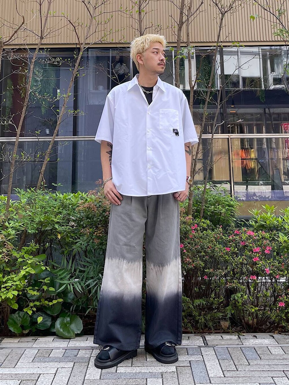 夏のシンプルコーデ トップスのシャツはハリ感があり緩めなサイズなのでワイドのデニムパンツととても相性が良いです! パンツはグラデーションで色が抜けているデニムパンツでシンプルなスタイリングにはもってこいのアイテムです!