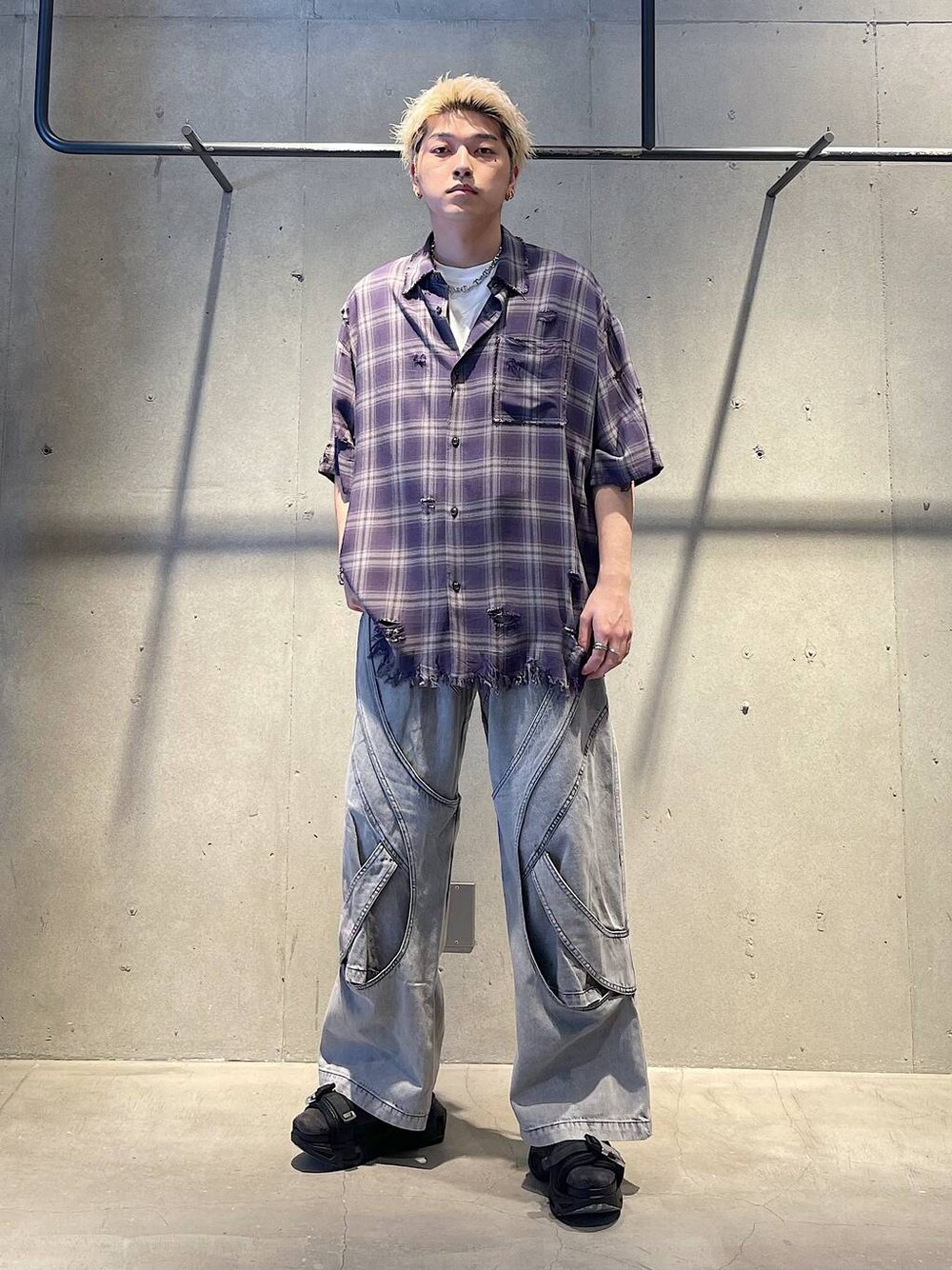 夏のカジュアルコーデ ダメージ加工が施されているチェックシャツは1枚で存在感のあふアイテムです! デザインが強いデニムパンツと合わせてカジュアルな印象にしたスタイリングになっています!