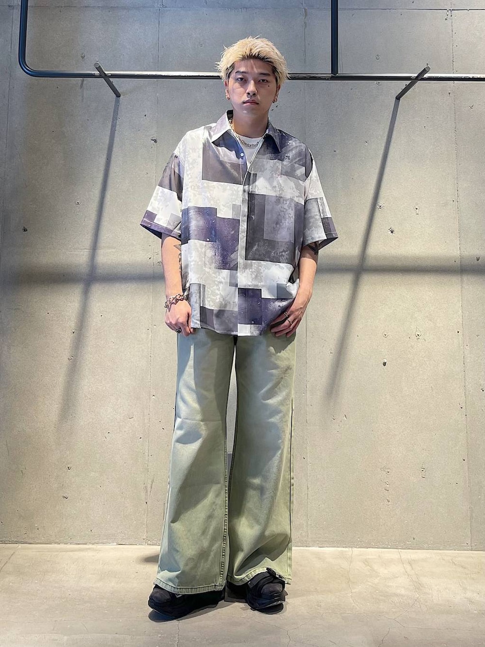夏のシンプルカジュアルコーデ 総柄のシャツは派手な印象は少なくきれいめ大人っぽい印象で着ることができます! パンツは珍しいカラーなので他と被りにくいです!