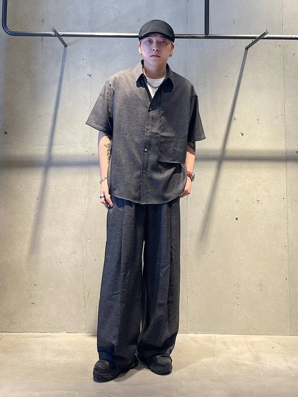 夏のセットアップコーデ 緩いシルエットのきれいめなセットアップです! 生地感はサラッと来ていてシワのつきにくい素材でTシャツの上から羽織るもいいし1枚で締めて着るのもオシャレなアイテムです! ワイドパンツは若干裾が細くなったいるデザインなので靴に溜まるのもオススメです!