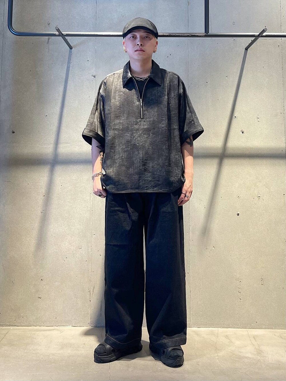 夏のシンプルきれいめカジュアルコーデ ハーフジップのシャツは涼しげな素材感でさらっとしているので夏にピッタリなアイテムです! デニムパンツと合わせてラフな印象のスタイリングになっています!