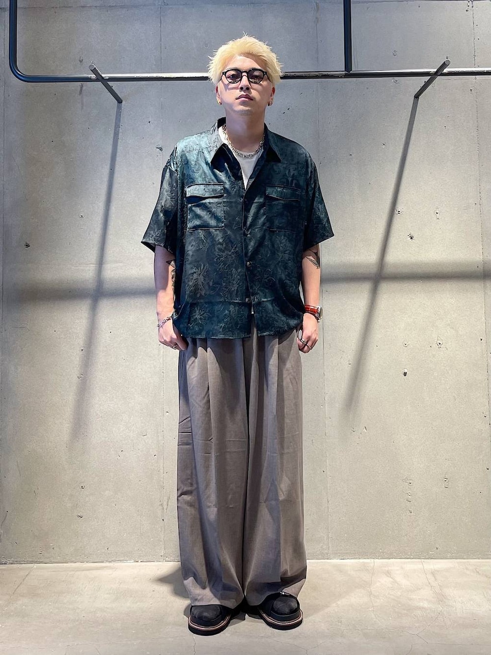 夏の大人カジュアルコーデ トップスは夏といえばの柄シャツです! 総柄で派手なデザインですがツヤ感のある生地なので大人っぽい印象で着れます! パンツをワイドパンツと合わせることで今っぽいスタイリングになります!