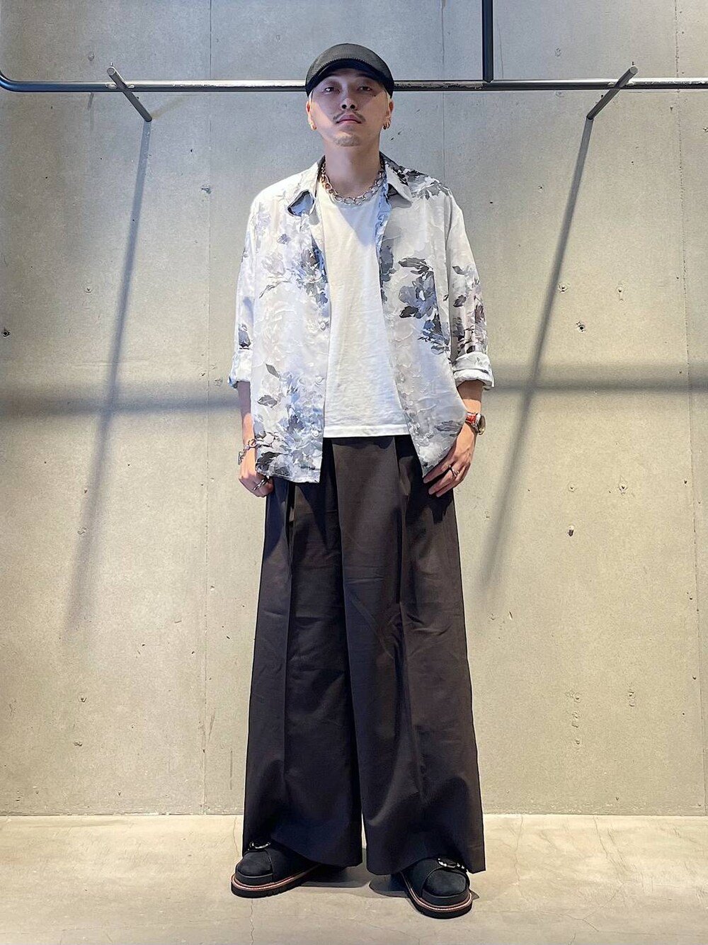 夏のきれいコーデ シアーの柄シャツはハレらしい花柄になっていて程よい透け感があるので長袖でもサラッと羽織ることができます!