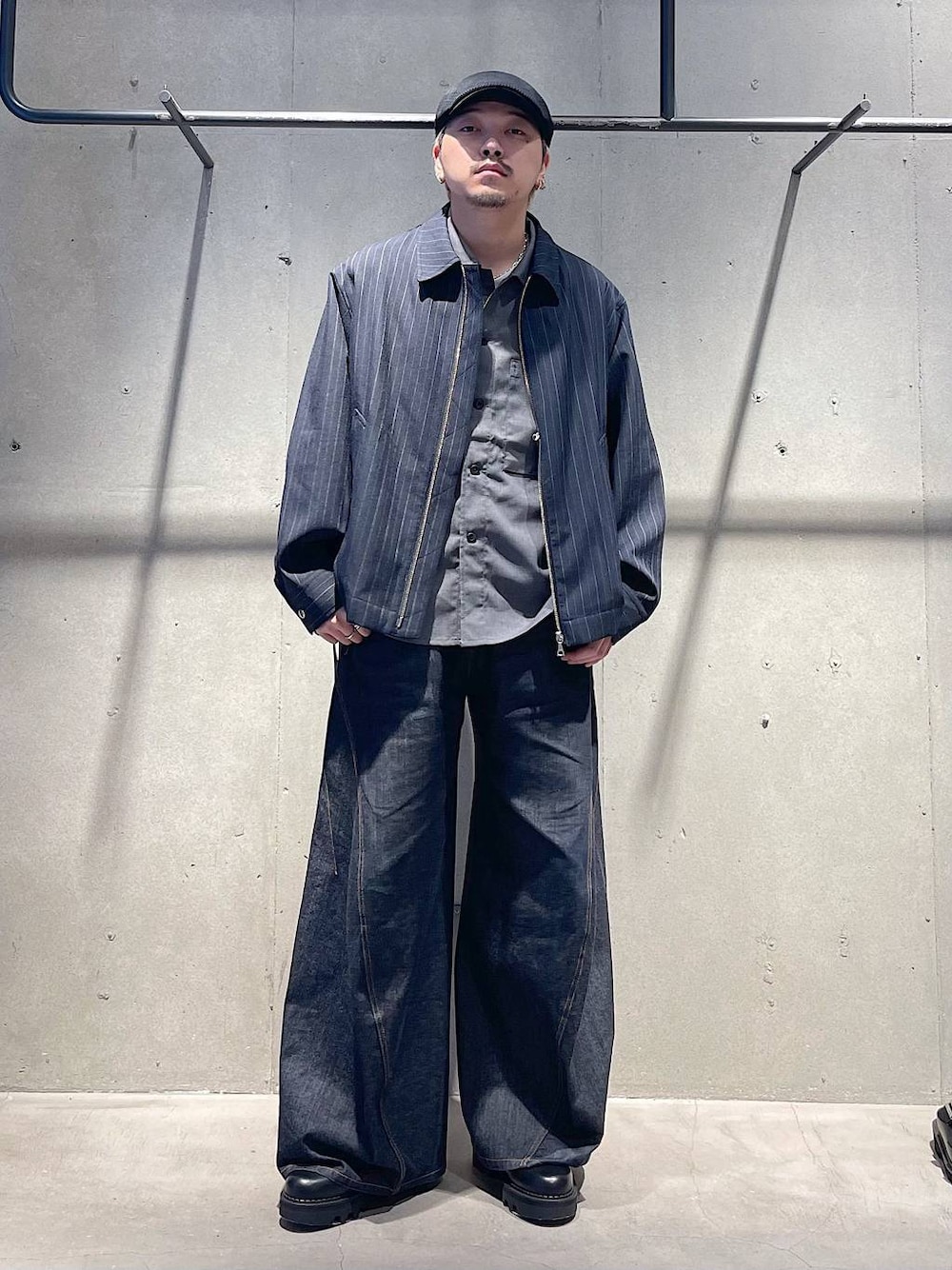 秋のカジュアルコーデ オーバーサイズのブルゾンにワイドのデニムパンツを合わせたベーシックなカジュアルコーデです! ブルゾンはストライプ柄で今っぽいデザインになっています! パンツは濃紺のデニムになっていて他にはない3Dデザインのシルエットになっています!