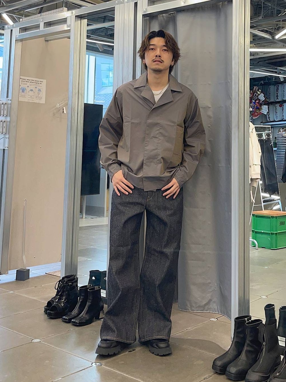 春の大人シンプルコーデ HAREの新ライン、「NARRIL」のアイテム シャツジャケットのデザインのアイテムと濃紺のインディゴがとても相性が良く大人の色気が出るスタイリングになっています