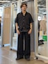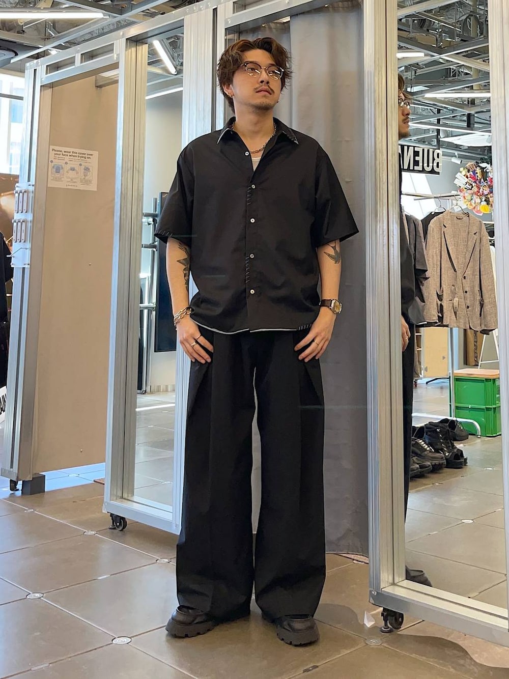 夏のシンプルオールブラックコーデ ステッチデザインが入ったシンプルなシャツにワイドスラックスのスタイリングは王道で1番キレイめ見えするオシャレなスタイリングです!